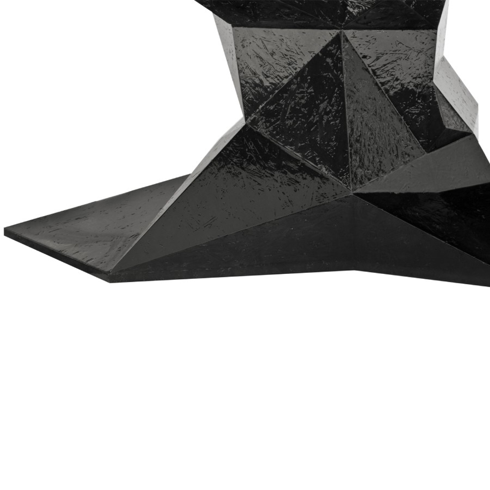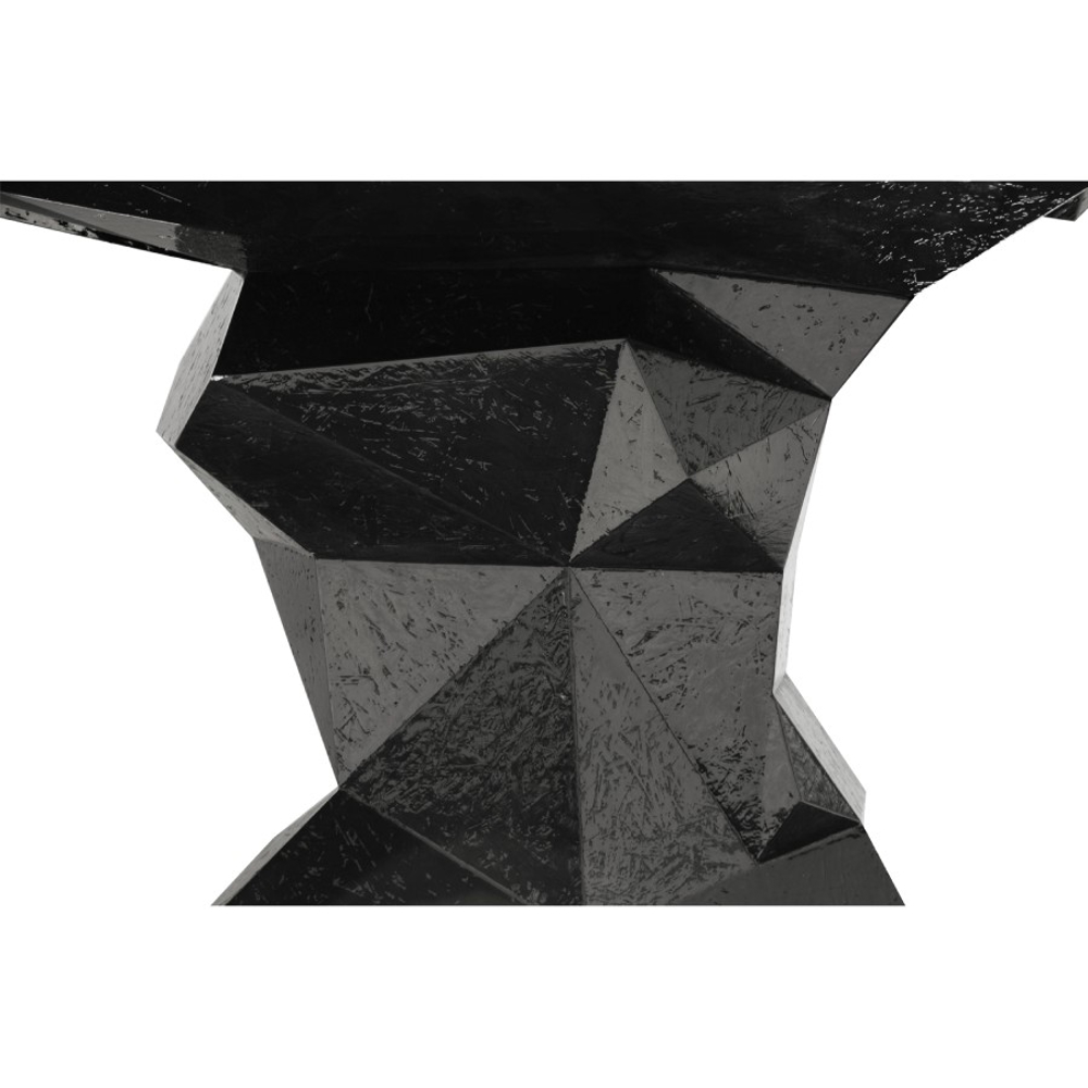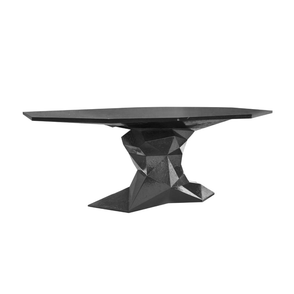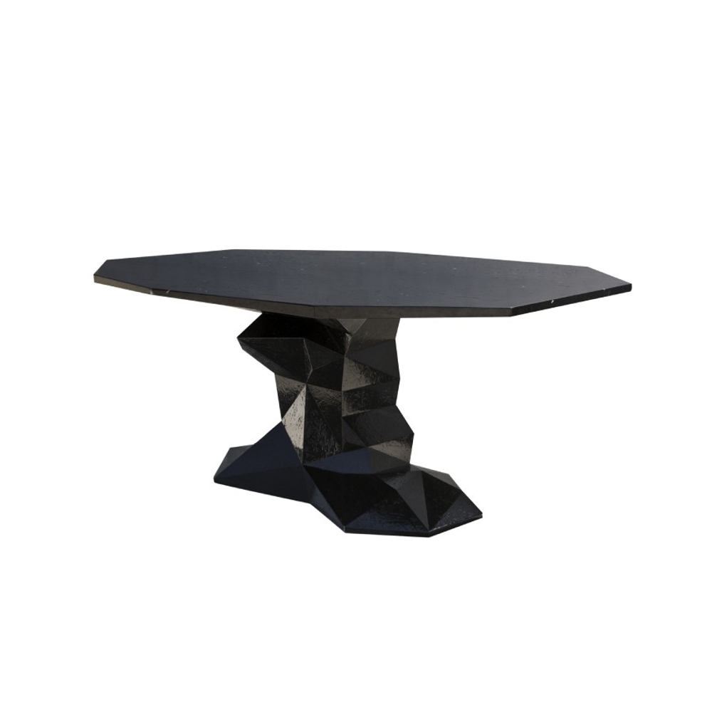 Table manually produced from wood with a irregular surface finish and a unique faceted form. Comes in a high gloss black lacquer finish.