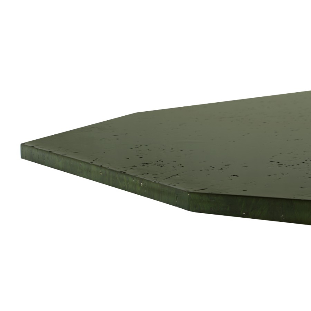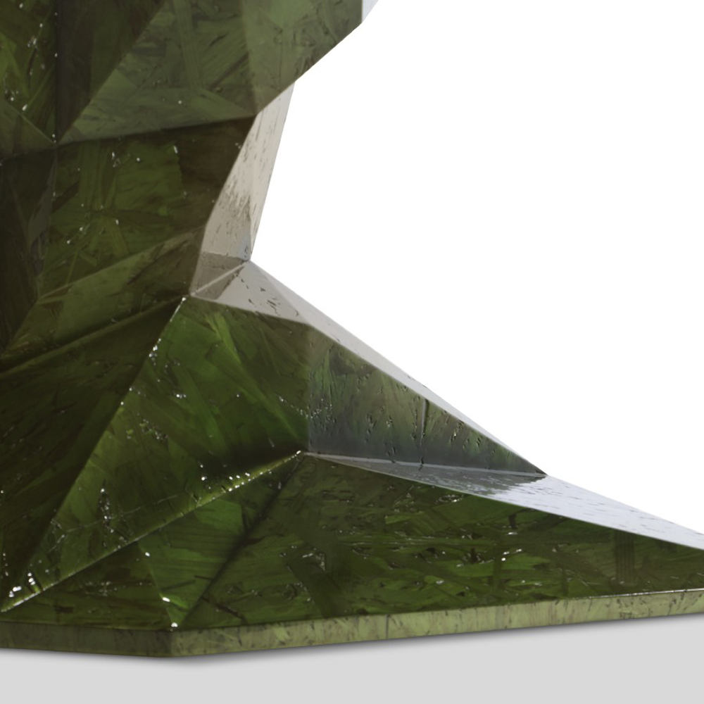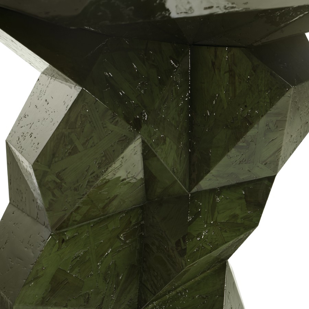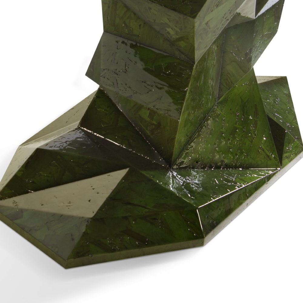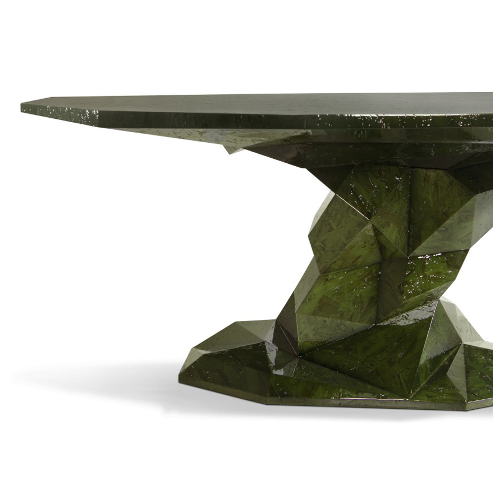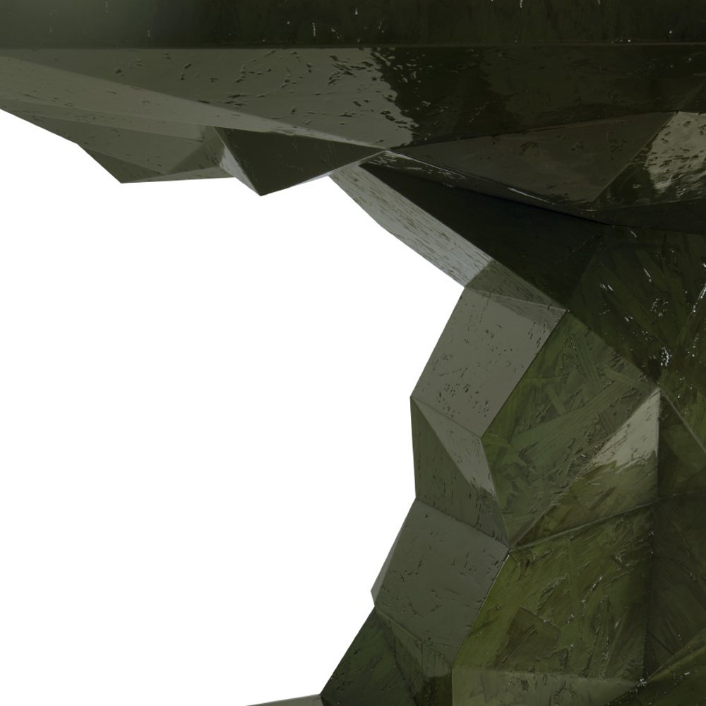 Table manually produced from wood with a irregular surface finish and a unique faceted form. Comes in a high gloss rainforest green lacquer finish.