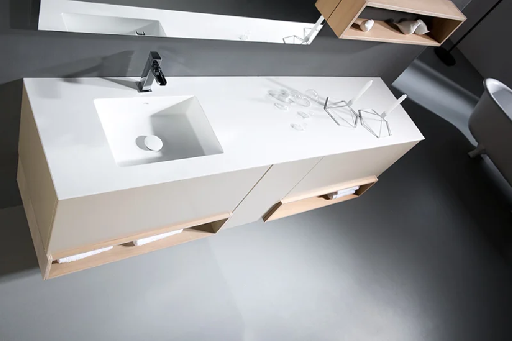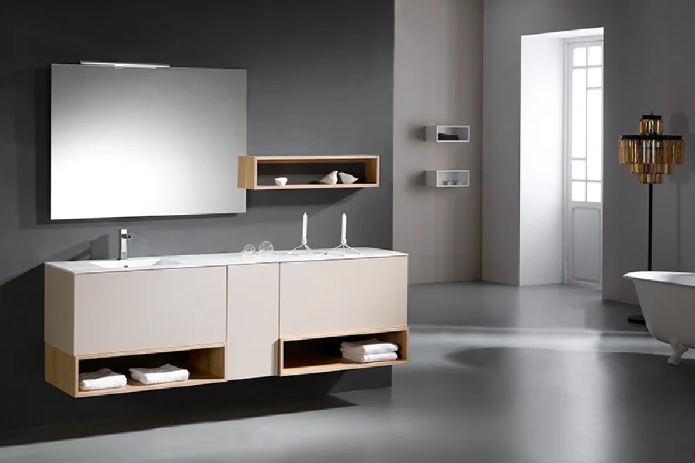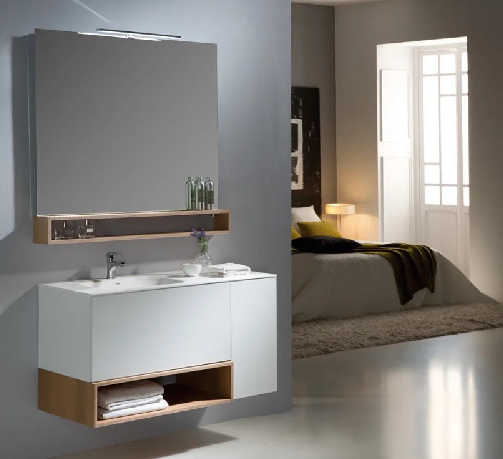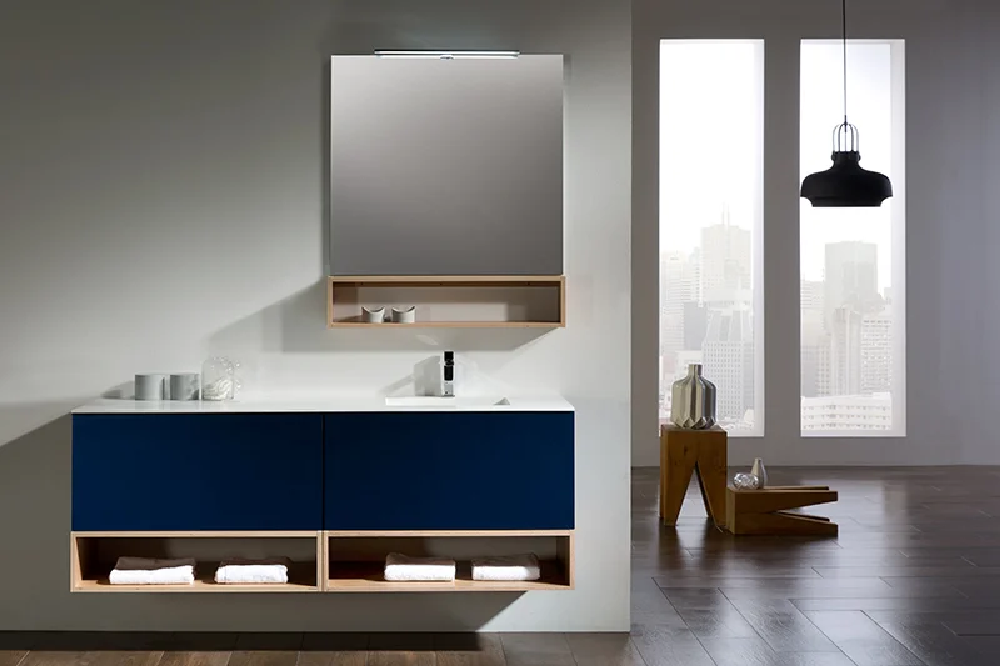 BOXY is a unit that is manufactured with water treated MDF and Mansonia marine wood. The beauty of the unit comes from the contrast of these two materials. The delicate lacquer surface contrasts perfectly with the Masonia marine wood. Description of the Boxy lacquer and wood finish bathroom furniture The Boxy bathroom cabinet has two drawers or one drawer accompanied by a shelf. This designer bathroom furniture is available in width 60, 80 or 100 cm. Combined with a 30 cm wide storage cabinet, the bathroom furniture with a lacquer and wood finish provides a more spacious vanity area. Materials and finishes available for this lacquer and wood finish bathroom furniture The Boxy bathroom vanity unit in water-repellent MDF and Mansonia plywood combines lacquer and wood finishes. The fronts of the drawers and doors in satin, textured or matte lacquer are available in multiple colors. The wood-finish shelf adds a warm touch to the bathroom. Boxy, an exclusive lacquer and wood finish bathroom cabinet by Legnori A recognized bathroom furniture brand, Legnori offers quality furniture such as the Boxy vanity unit. The know-how of the cabinetmakers in our design department allows us to manufacture functional and stylish bathroom furniture.