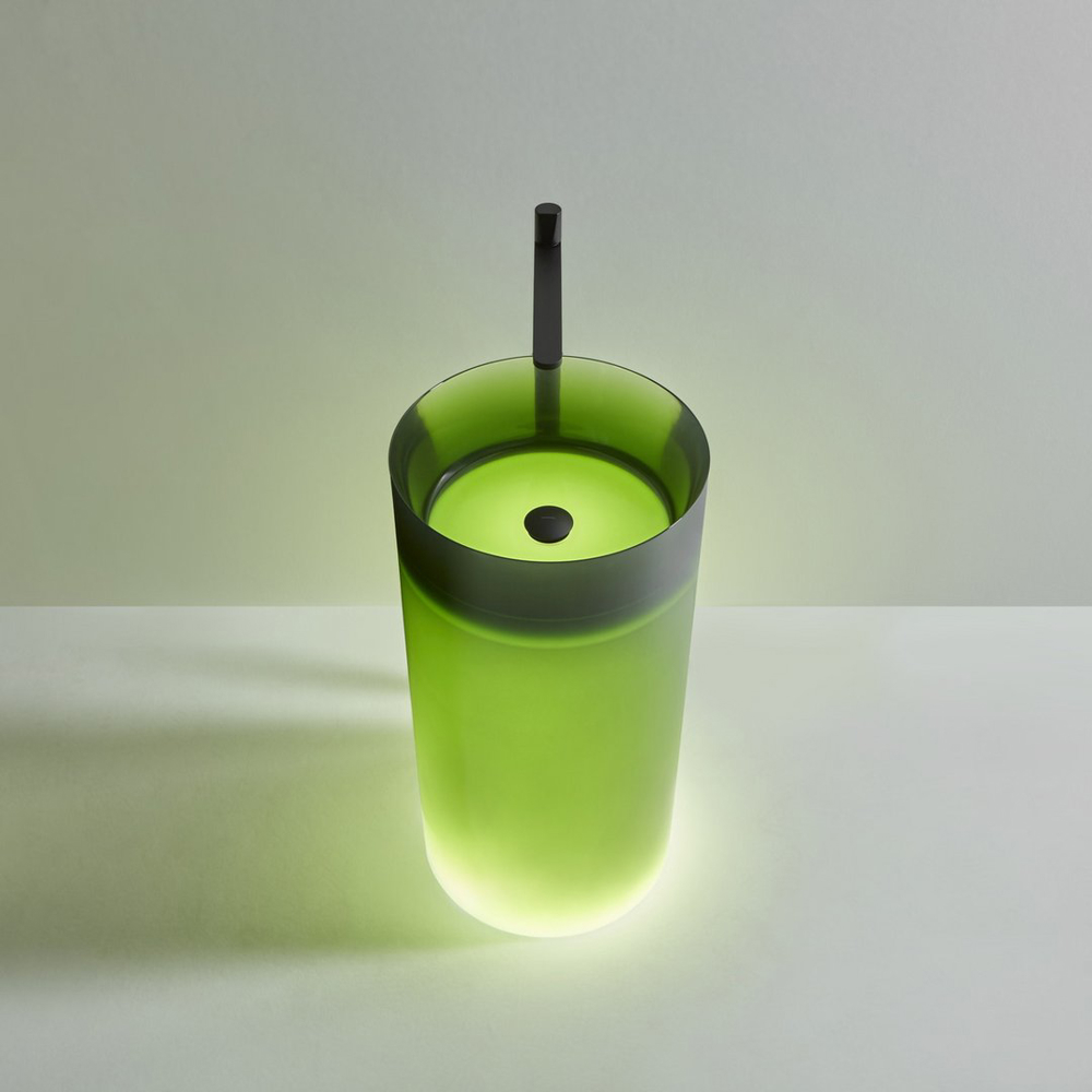 Freestanding Cristalmood or Icemood sink with floor drainage, without led lighting, available in various colors as per our samples, with a matt base complete with open plug, siphon and pipe.