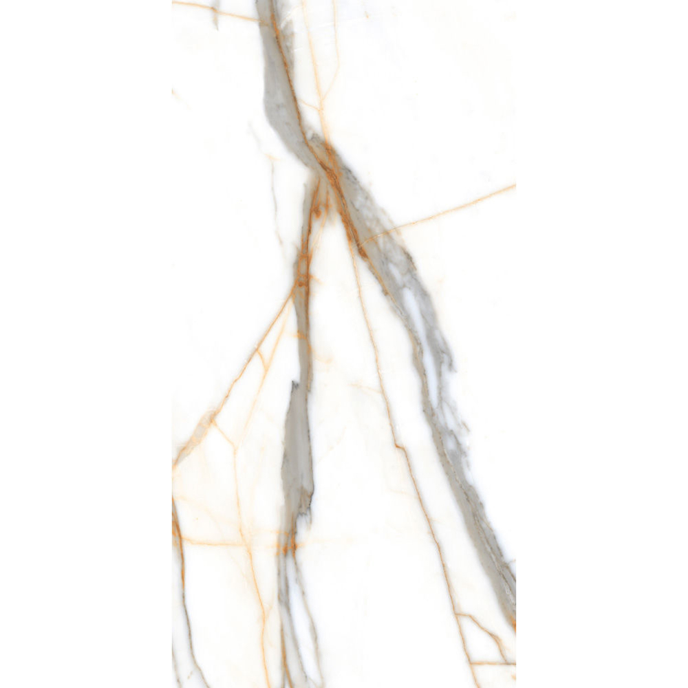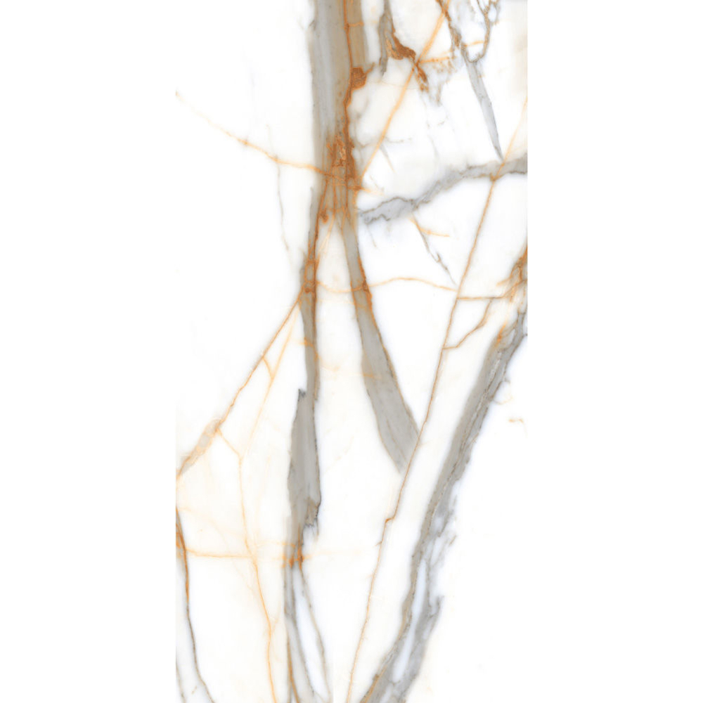 Calacatta gold white porcelain wall and floor tile offers an alternate white marble effect look for those not wanting the traditional grey veined tile. As a design colour white is often described as a relaxing colour, neutral to its surroundings, combine this with the beautiful natural marble-inspired vein patterns and you get a fusion of modern colour and a classic-looking floor. Marble has been the inspiration for interior floor tiles for as long as we have tiled floors, but the use of real marble can be fraught with difficulties. From the specialist sealers and cleaners required for its maintenance to the prohibitive cost of the stone and its installation, real marble is often simply not viable for most. However modern porcelain manufacturing has developed by leaps and bounds in recent years, and now with the availability of high-definition imaging technology, you can get a real marble-looking floor for a fraction of the price of the real stone. Ideal for use as a floor and a wall tile throughout the home this durable porcelain floor tile is perfect for busy living areas, hallways and of course bathrooms and kitchens.