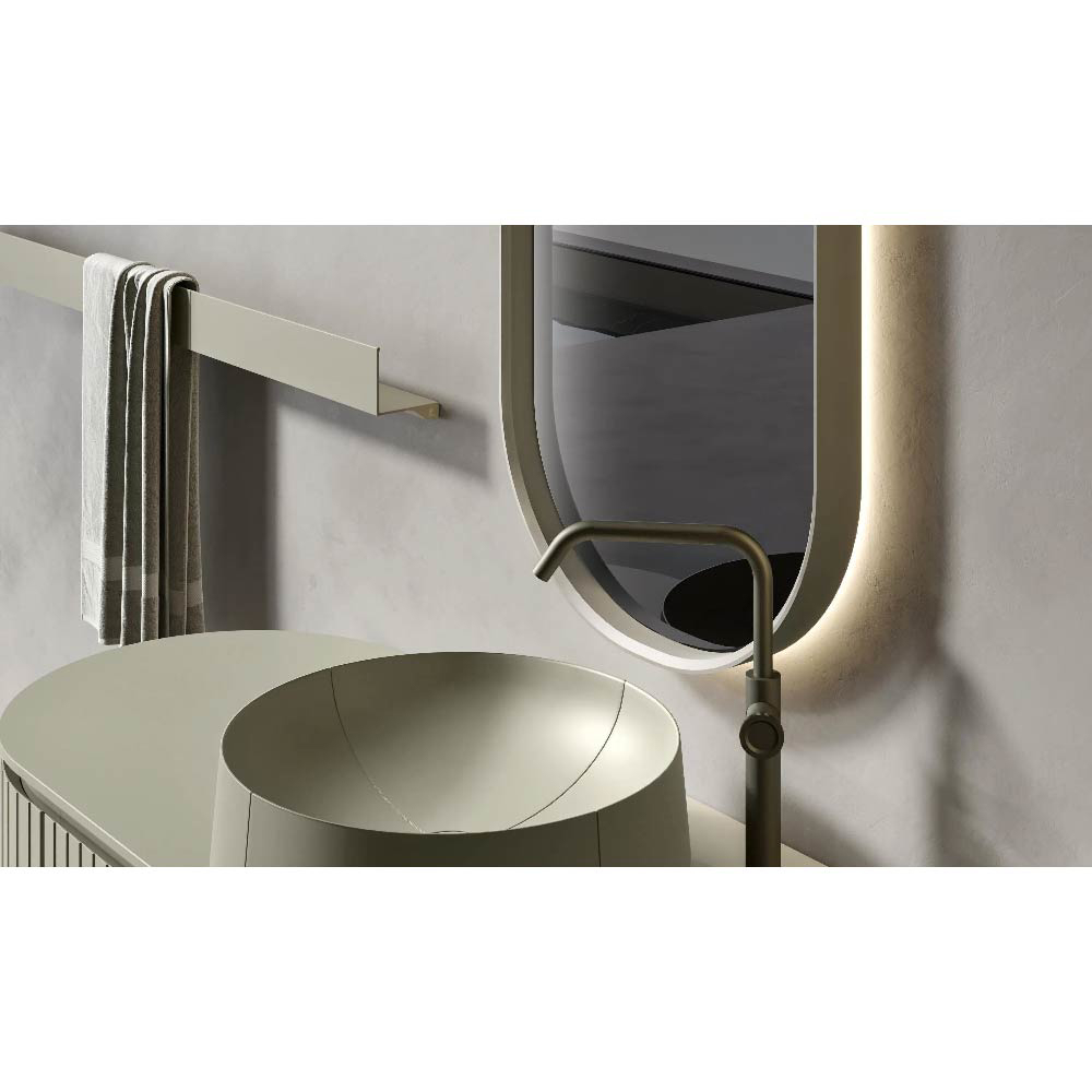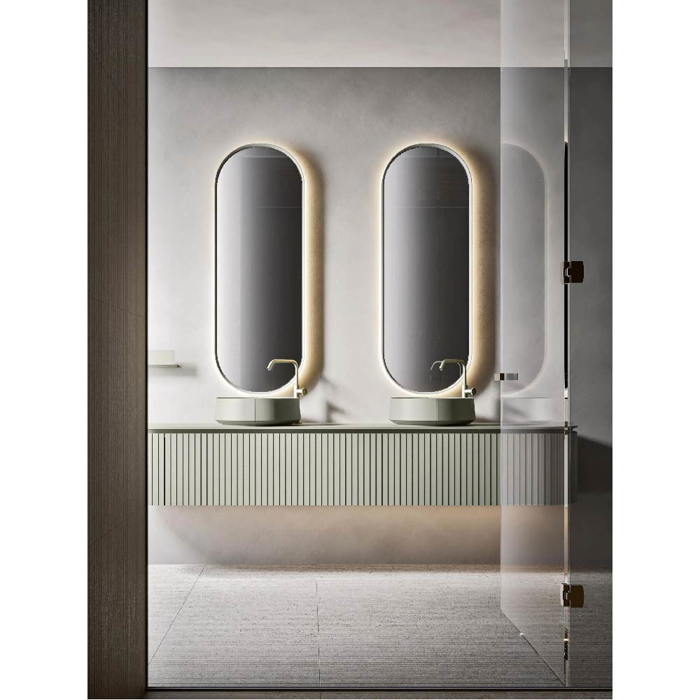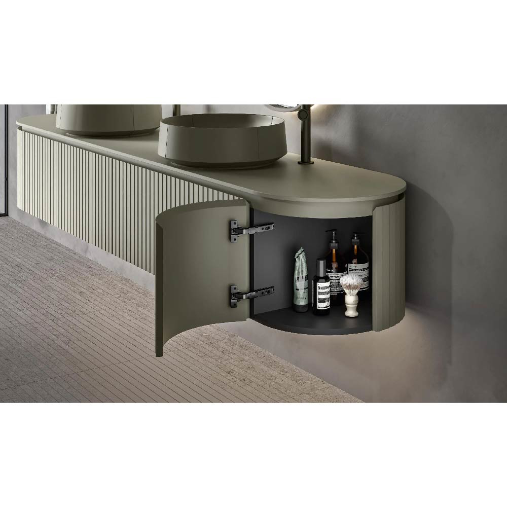 CALIPSO, in the two versions Squared and Circular, is characterized by the groove that runs continuously on three sides of the cabinet. A clean and elegant line, which demarcates the tops, emphasizes the top and loads of emphasis on the perception of the profiles. The lower volumes of the cabinet, thanks to the particular finishes suggested for this collection, seem almost devoid of opening lines and intuitively bring the attention on the throat, key to access the interior spaces.