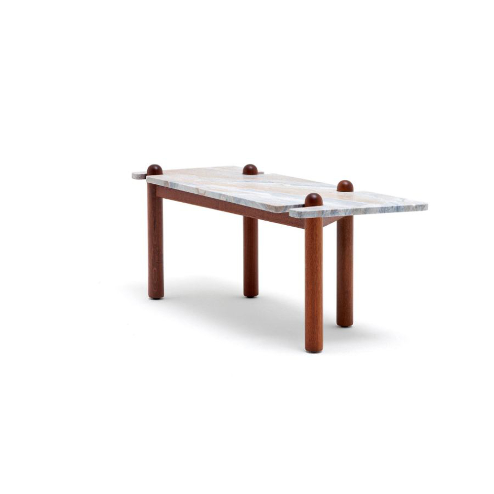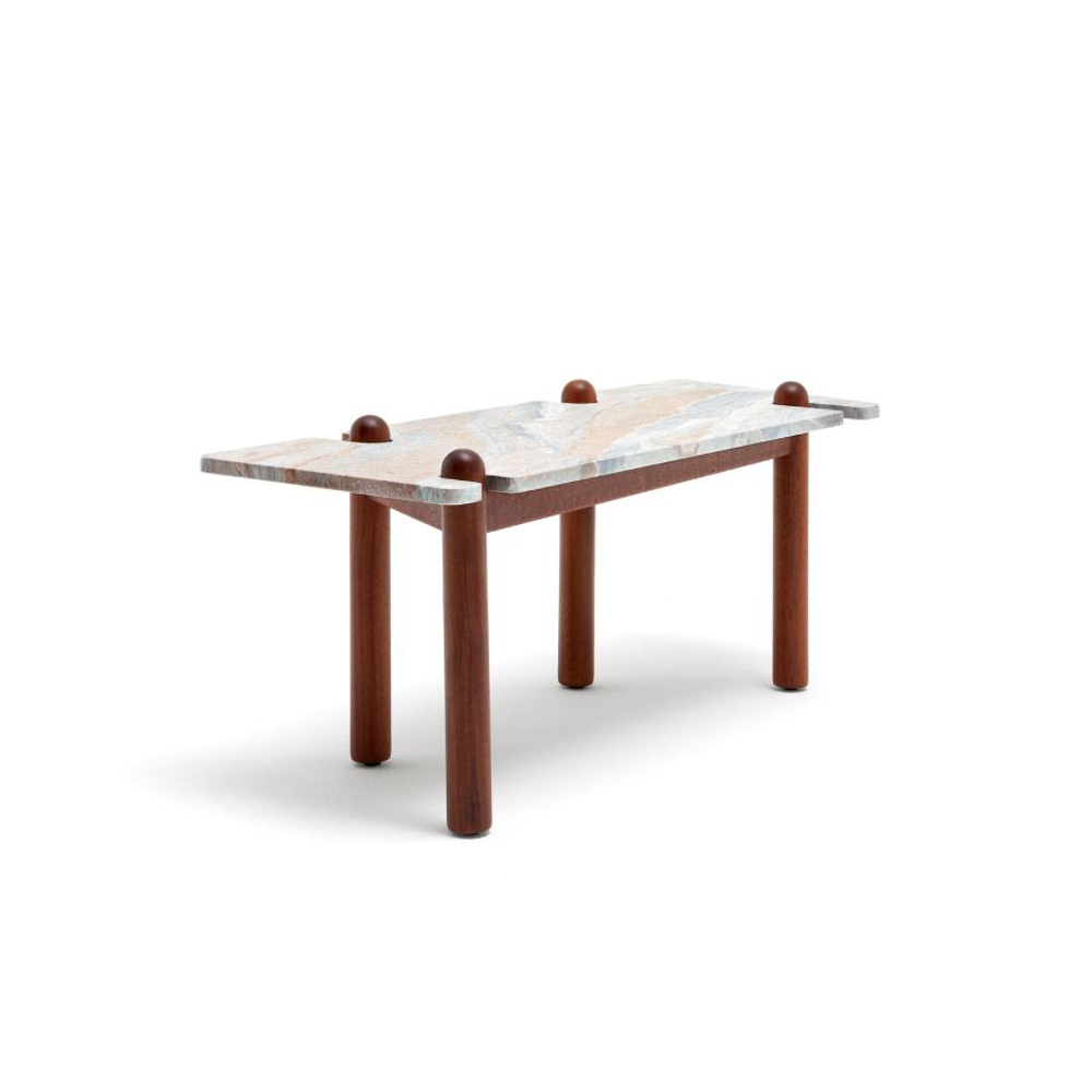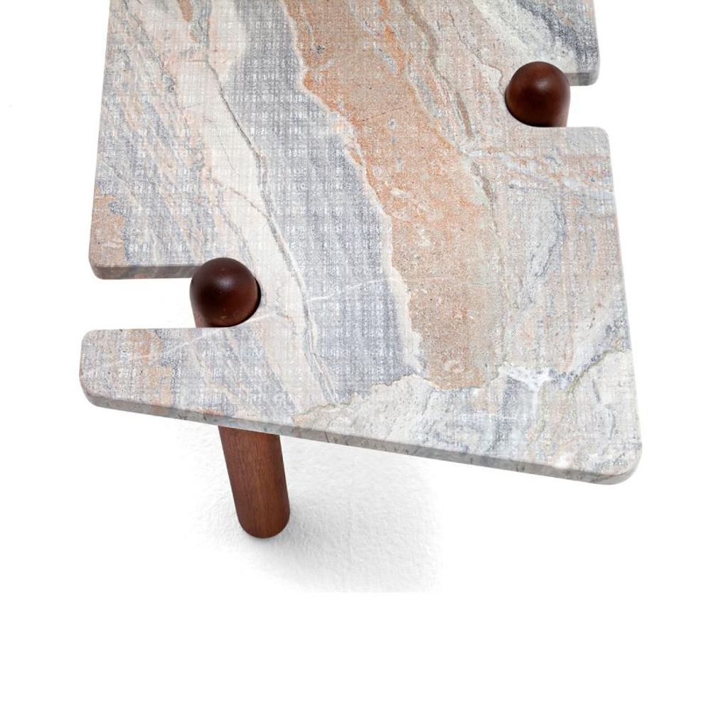 The perimeter of the top is interrupted, leaving space for the wooden legs, which accommodate the marble recesses. The asymmetrical cut of the stone gives the element a peculiar dynamism.