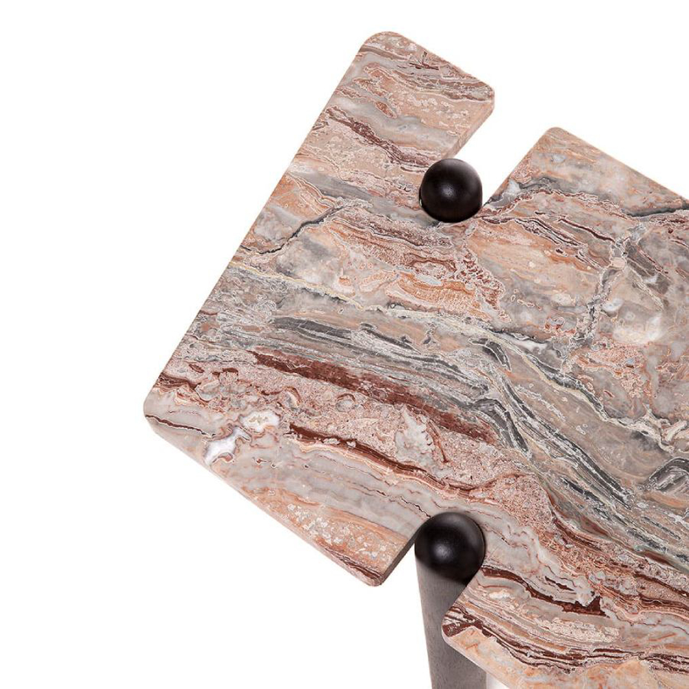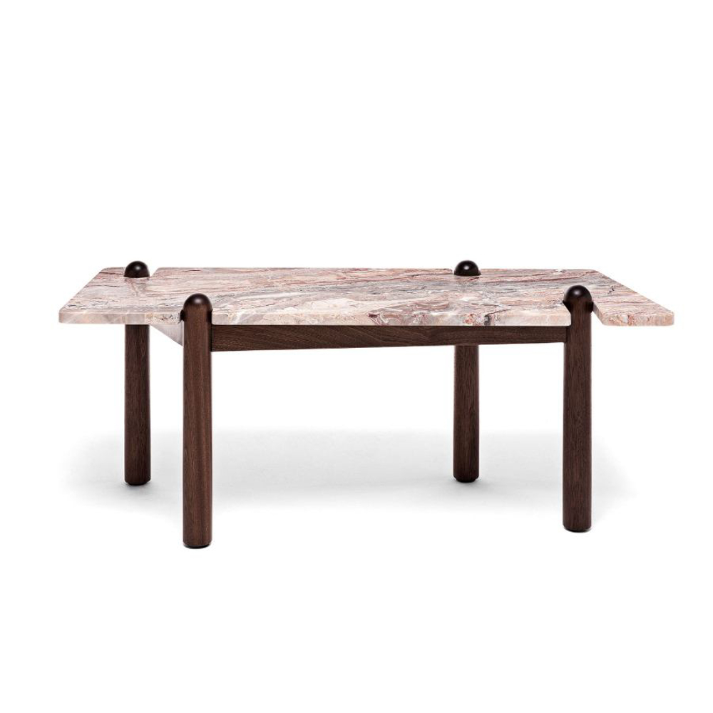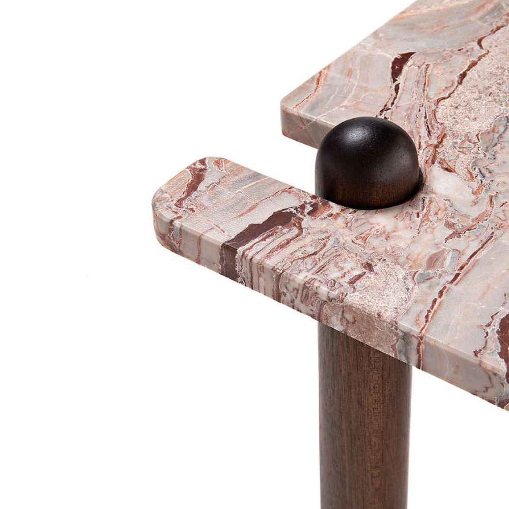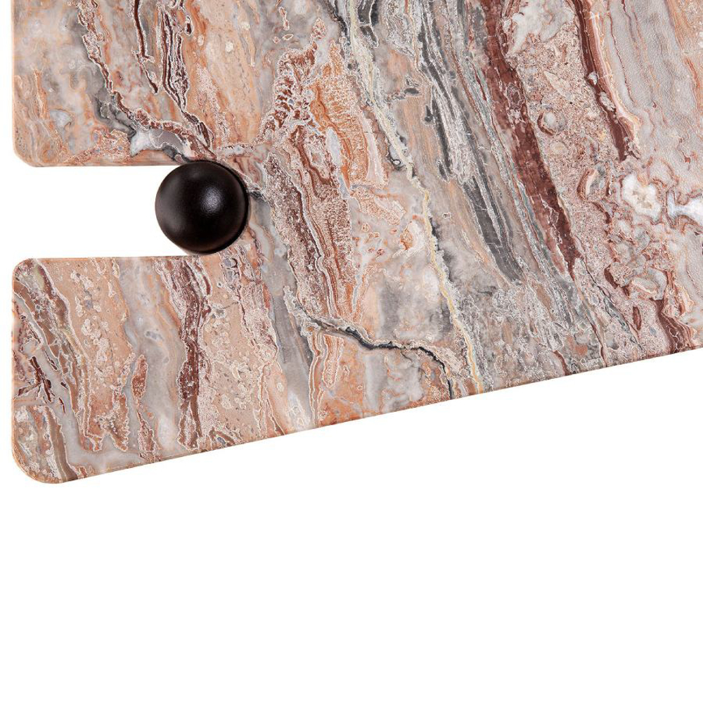 The perimeter of the top is interrupted, leaving space for the wooden legs, which accommodate the marble recesses. The asymmetrical cut of the stone gives the element a peculiar dynamism.