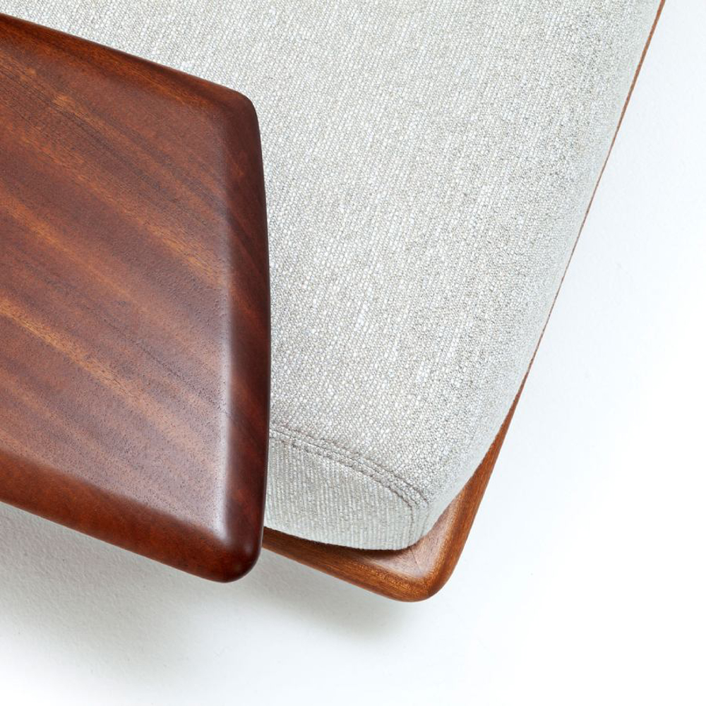 While the accessories, like the structure, are made of mahogany, the soft lines of the cushions interweave shapes that perfectly fit the sofa and make the seat even more comfortable.