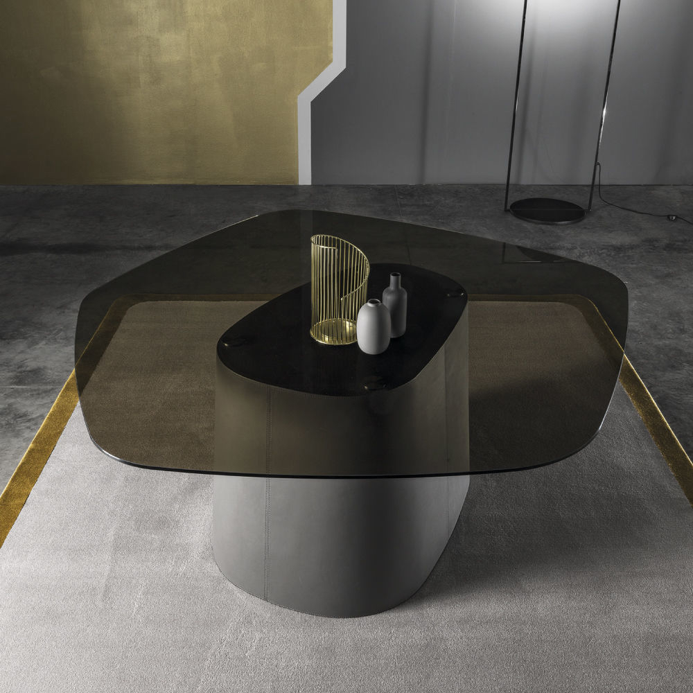A masterpiece of modern and ultra glam design for living room or dining room that wants to differentiate by focusing on details, matching leather or lacquered finish with glass. Perfectly at ease at the center of attention, Capri table renounces the classic legs in favor of a single connecting element, a central conic leg covered in elegant or luxury leather.