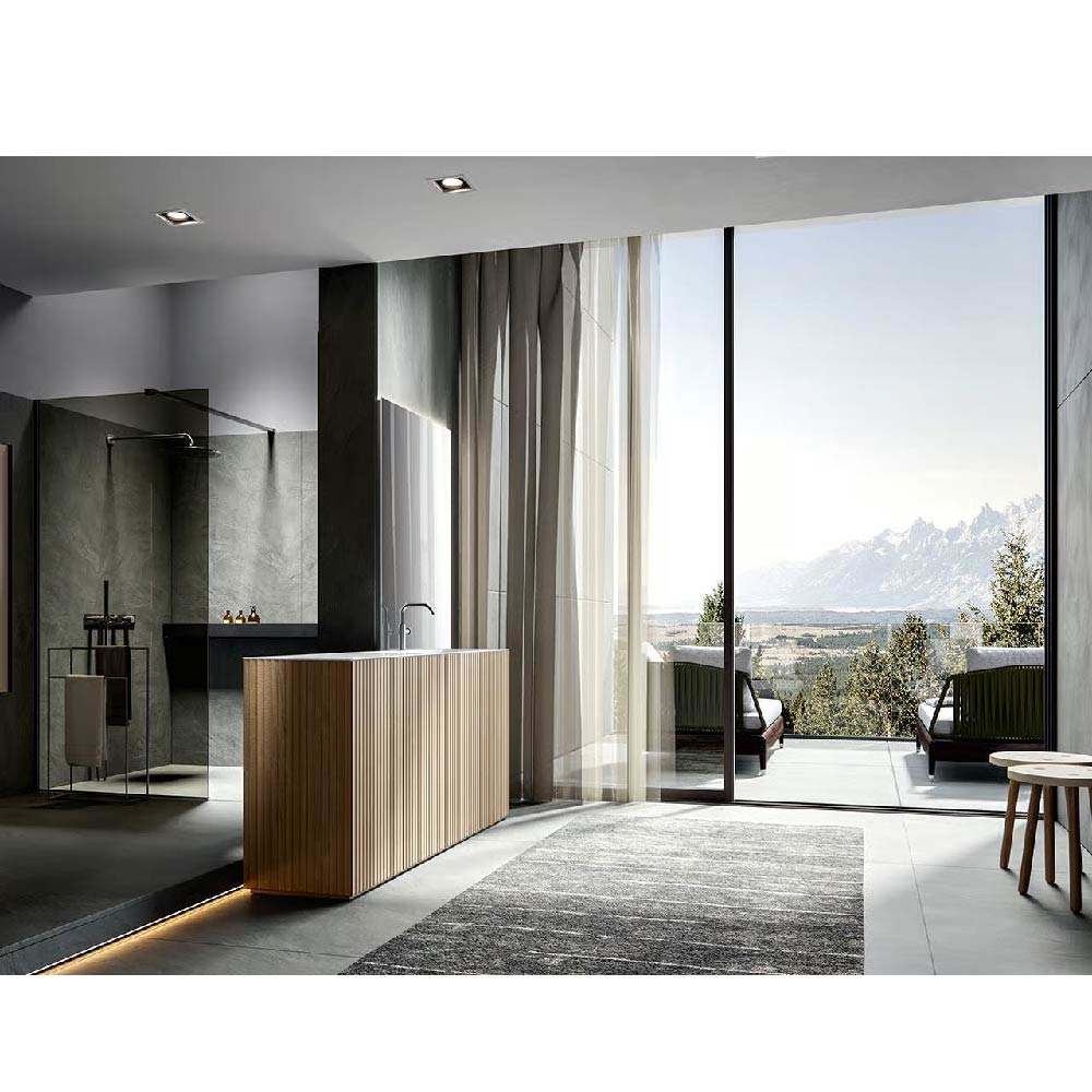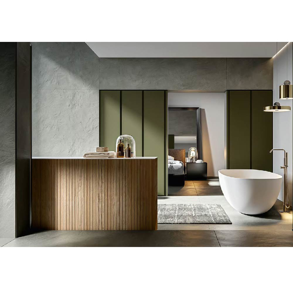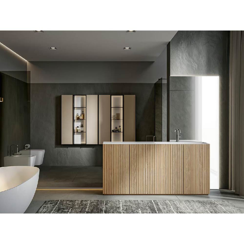 CHR4001 Integrated top Chrono17.32" in Stonematt. Vanity units in Texture Veneziana Naturale finish. Decorating mirror. Dimensions: W.70.87" D.17.32"