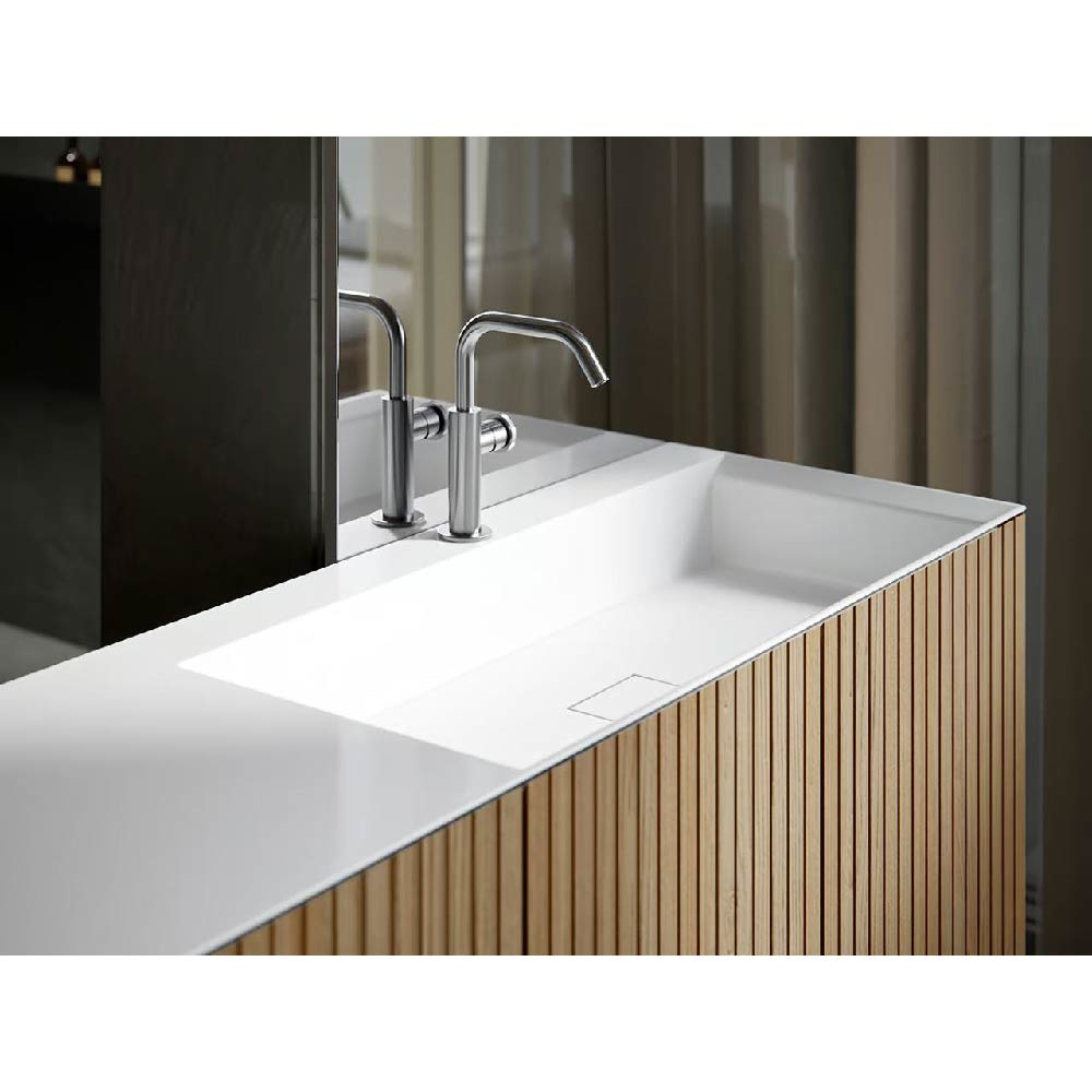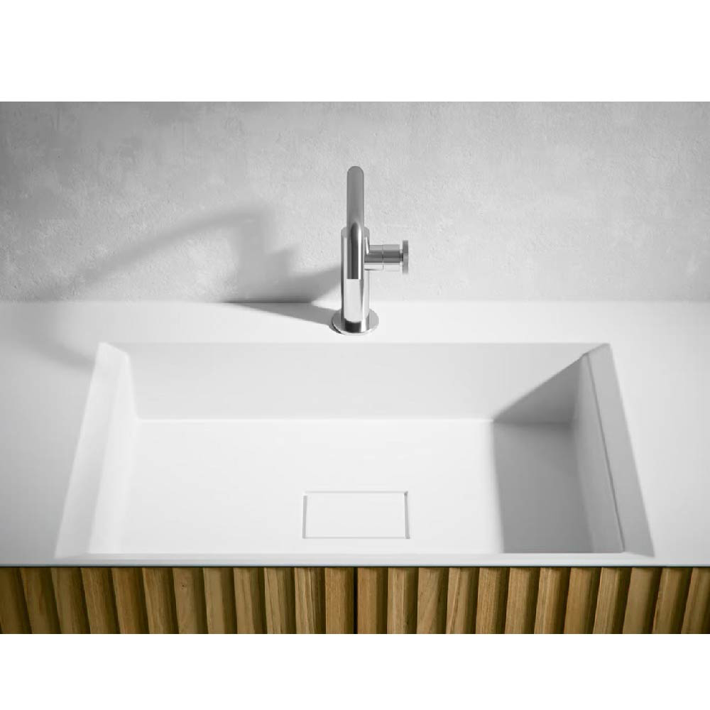 Maximizing the space of vanity units with reduced depth: this is the mission of Chrono14.96"/17.32". Thin profiles, clean and essential lines designed to fully exploit each centimeter of surface, also on vanity units with reduced depth. Moreover, Chrono14.96"/17.32" allows to chose among 3 different mixer positions.