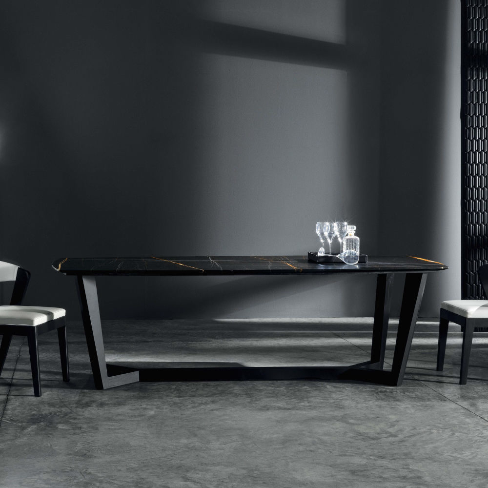 Every detail of Circomassimo table reveals a strong, noble and luxury character, suitable in contemporary or modern design. An impressive and precious table, but essential al the same time. The design of its solid wood legs – which can be made in Canaletto walnut or ash – is original, elegant and effective. They join together and form a double longitudinal Y parallel to the top.