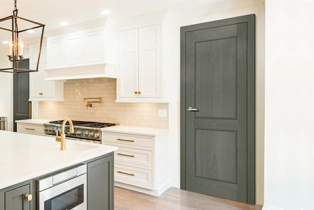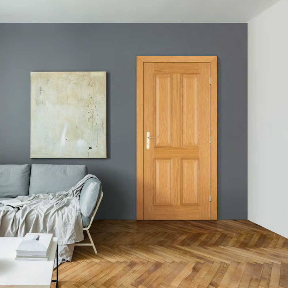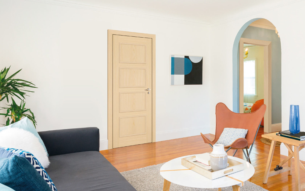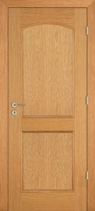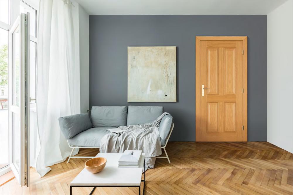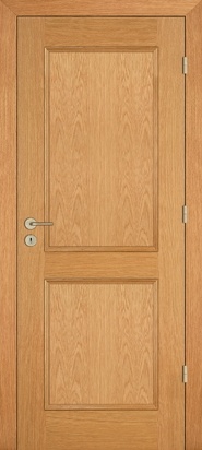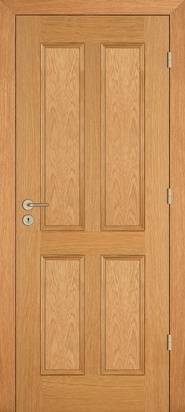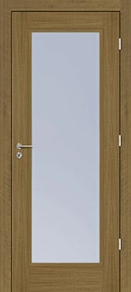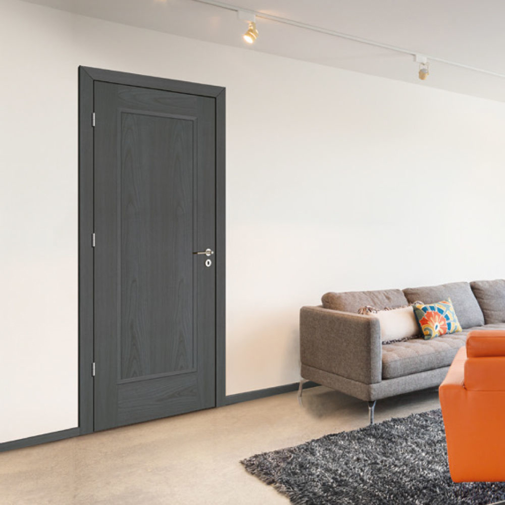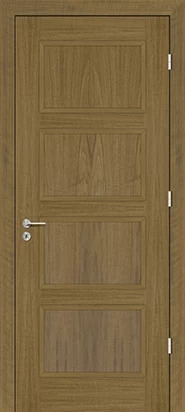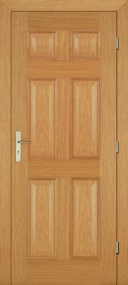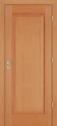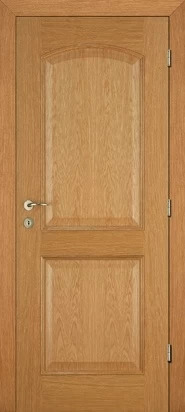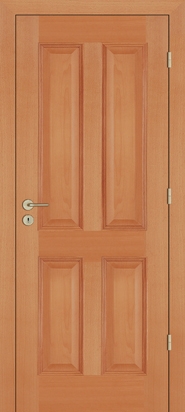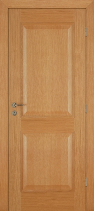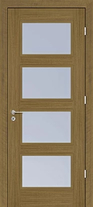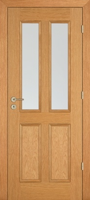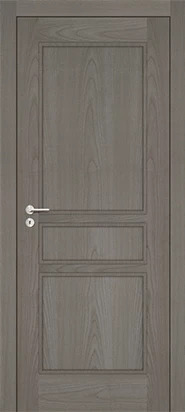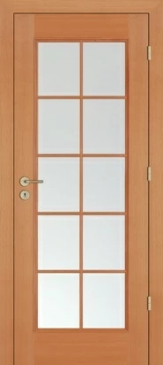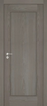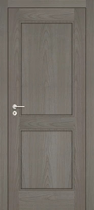 Rails and stiles in solid wood, interior in solid core. Faces with glass openings with grill, flat, raised, fielded panels and hardwood mouldings.