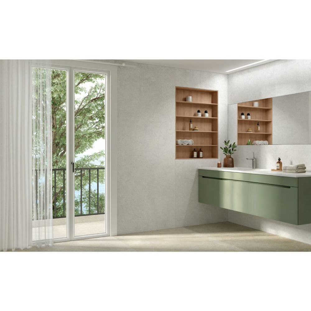 The collection comes in a soft warm colour spectrum in keeping with current trends, perfect for creating soothing, harmonious living spaces. This porcelain tile collection comes in two finishes and a choice of different thicknesses, depending on the applied technology and intended use of the tiles. In the case of the Shaped finish, the design is carefully aligned with the relief pattern found on this kind of stone. These tiles come in an 5/16" thick 40"x40" format or a 1/4" thick 40"x108" one, ideal for bringing a restful air of elegance to living, whether public or private. The Non-Slip finish is available in a 40"x40" format in either an 5/16" thickness or the highly popular 13/16" thick one, conceived to help create robust, visually appealing outdoor paving. The collection also features matching white-body tiles so that living spaces can be created with an all-round, unified appearance.