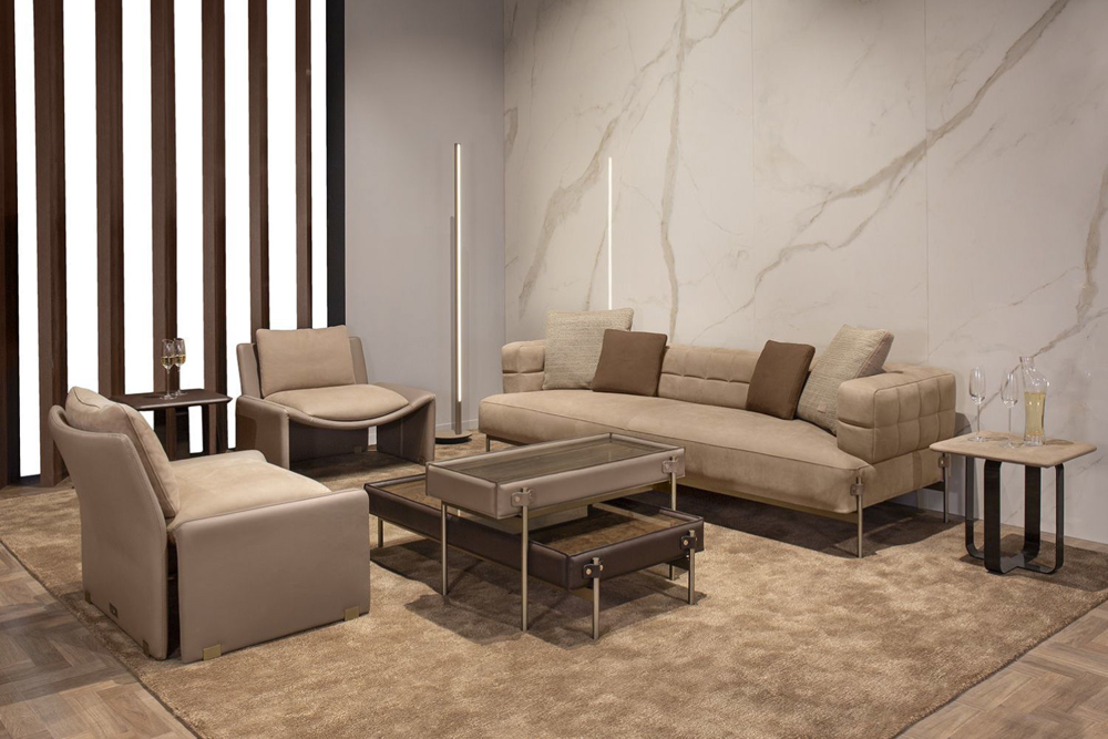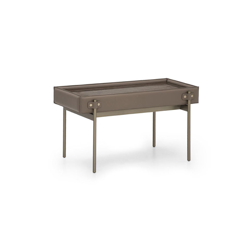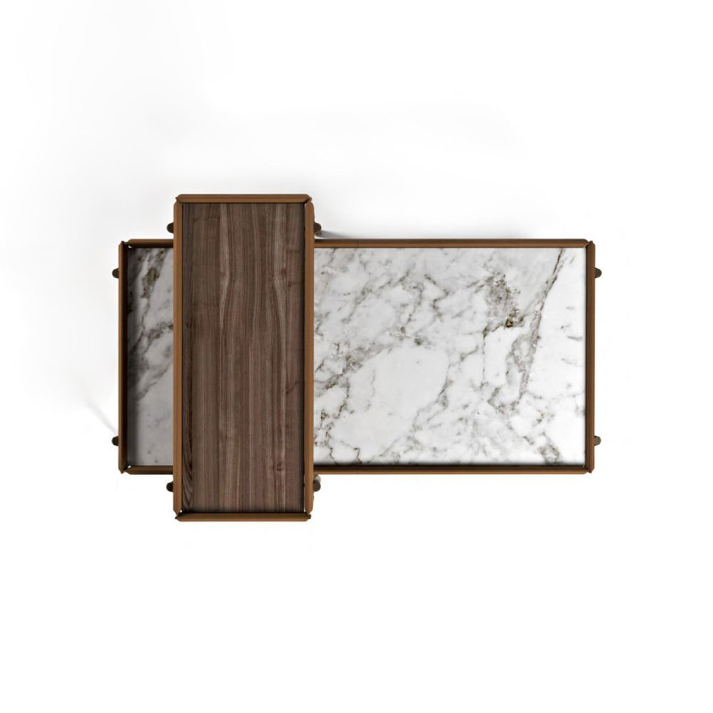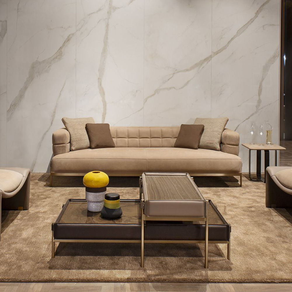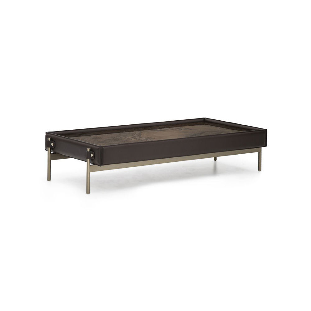 Low Coffee Table: Top in Eramosa marble “cross cut”, frame in Cuoio leather col. Dark Mocha, flaps in leather Cuoio col. Dark Mocha, metal structure & metal buttons with AM logo in light gold finish. High Coffee Table: Top in Eramosa marble “straight cut”, frame & flaps in Cuoio leather col. Taupe, metal structure & metal buttons with AM logo in light gold finish.