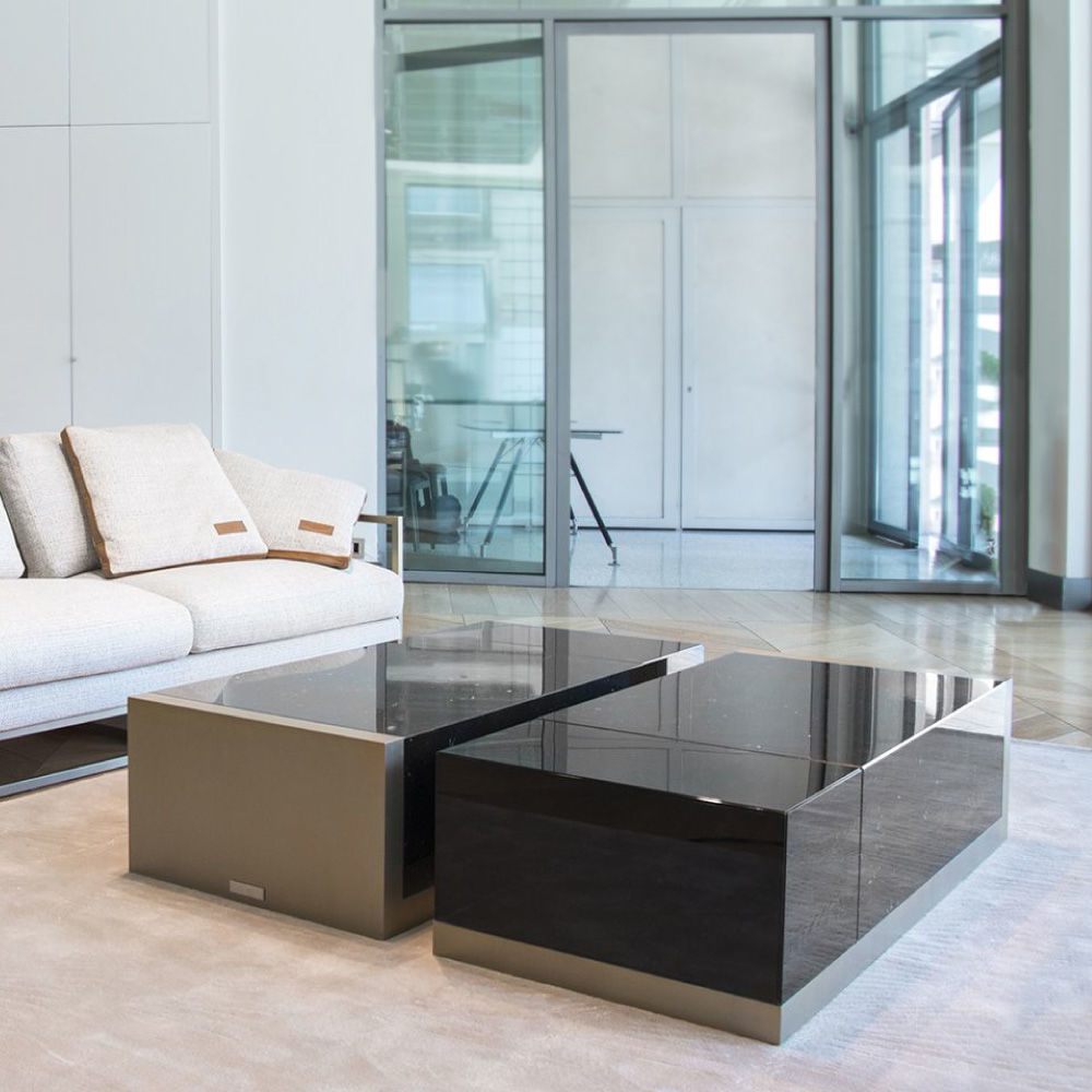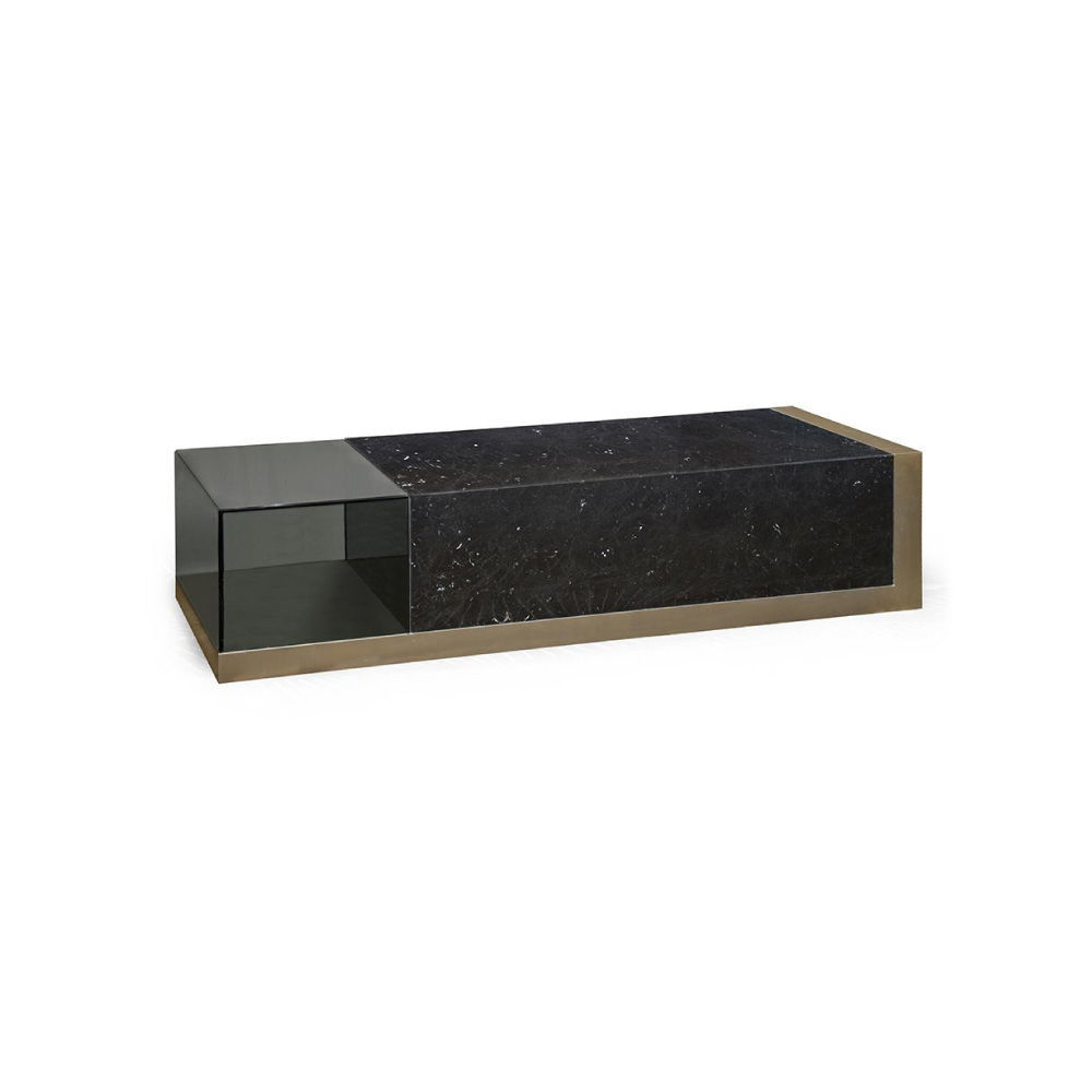 Frame in metal Light Gold satin finish, top in marble Black Marquinia & glass fumé.