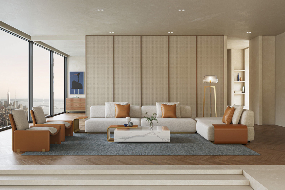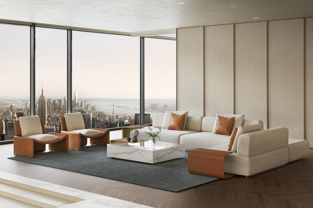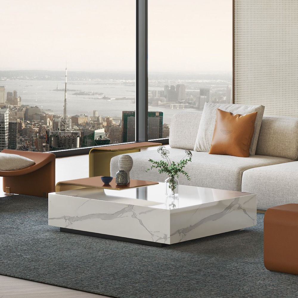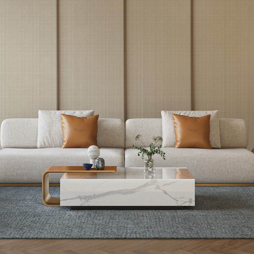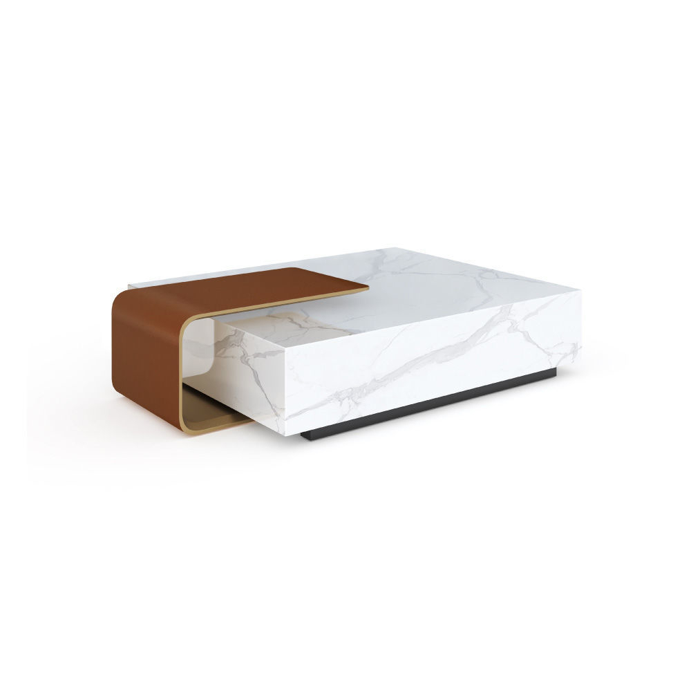 All in marble Carrara. Side table external side in leather Cuoio col. Kestral Tan, internal side in pale gold finish.