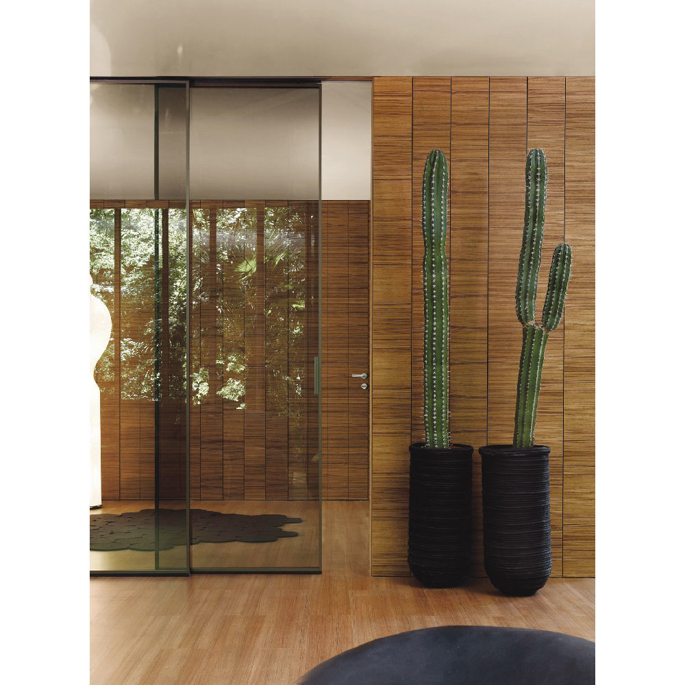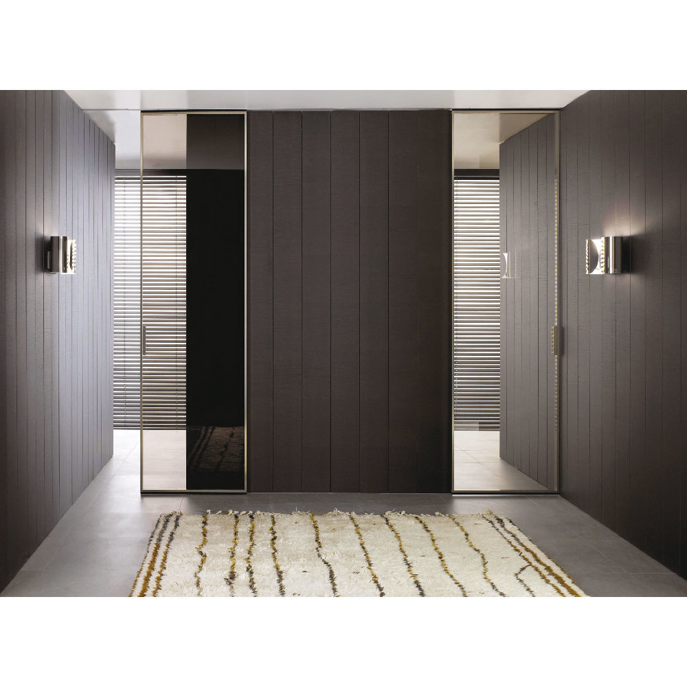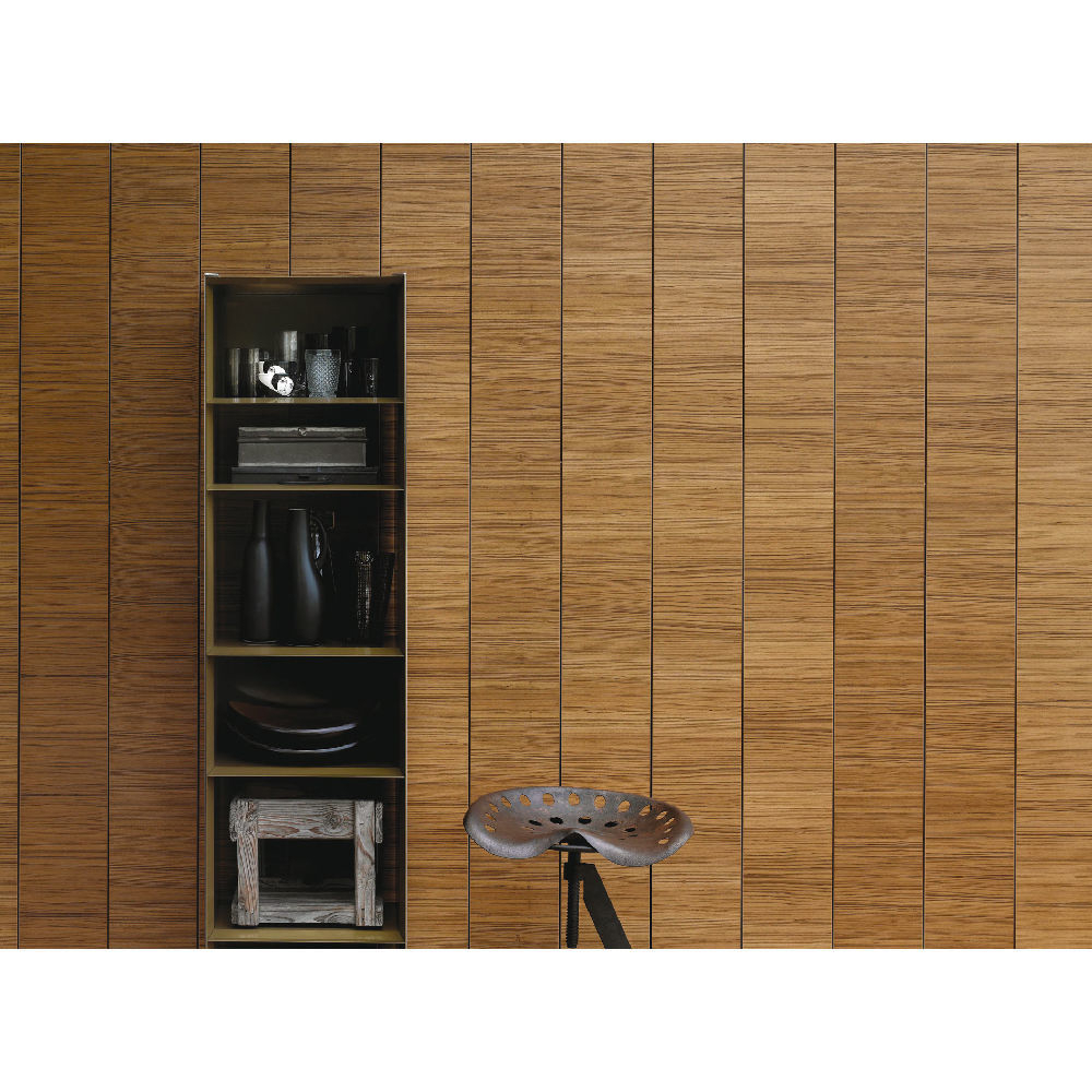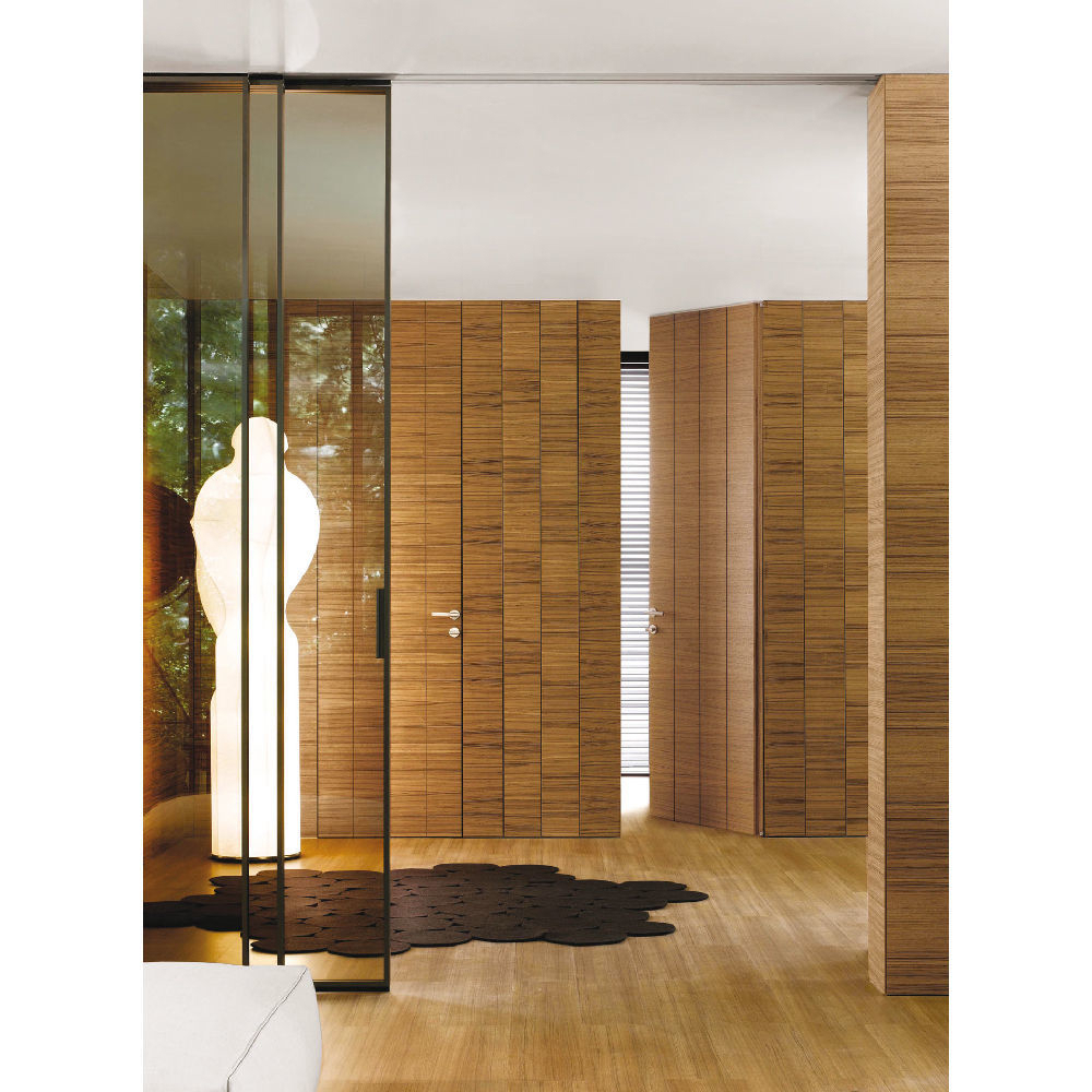 Paneling system with aluminum substructure and the possibility of hinged doors with push or pull opening. Standard staves 199 mm. wide and 20 mm. thick, available in various finishes. Substructure with vertical profile in matt lacquered aluminum. with dedicated hardware for installation. Hinged door 56 mm thick, in various finishes; predisposed for locking with only handle, handle and latch or handle and cylinder with key. Also available in the double leaf version. Frame in matt lacquered aluminum with plastic gasket, two hinges and magnetic lock in satin chrome finish, available with or without upper horizontal frame. Possibility of applying shelves through the use of special rack profiles and invisible supports.