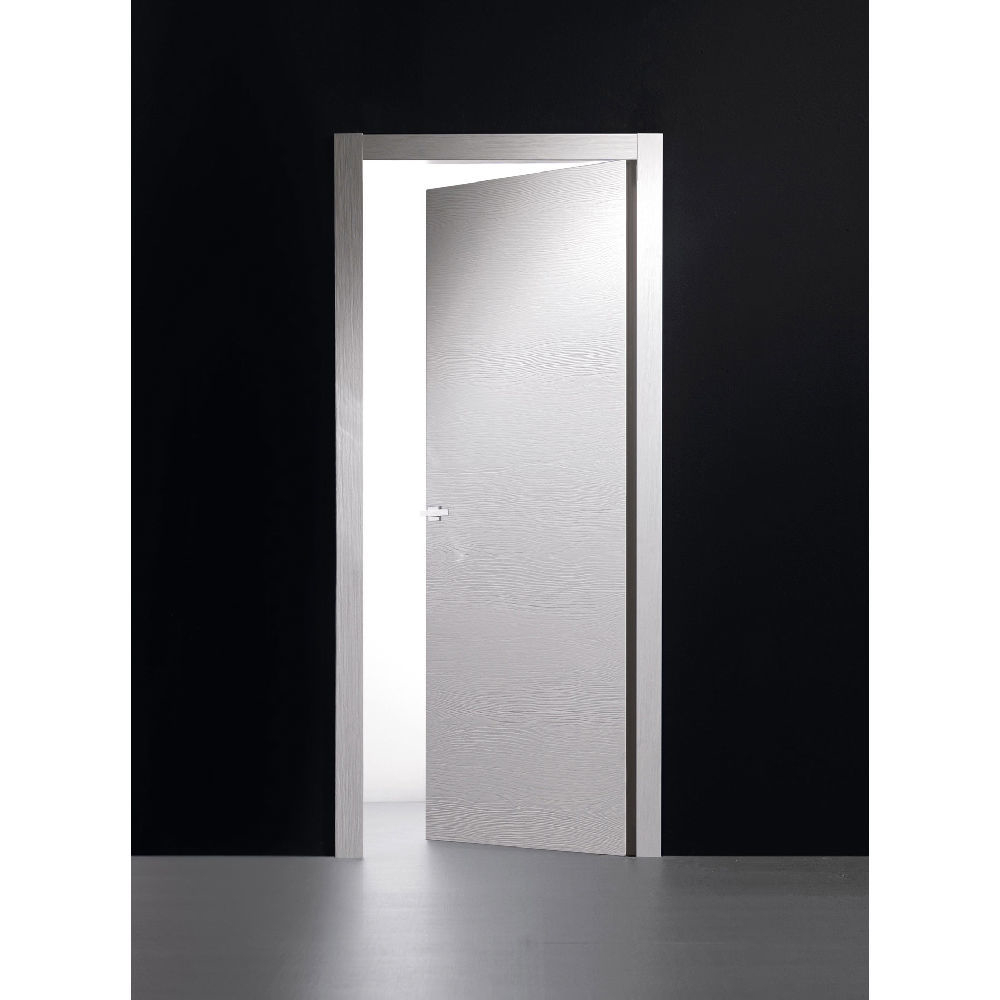 Internal door coplanar on the pushing side with trims to be installed on a wooden subframe. Plain panel, hollow core, thickness 46 mm opening by turning on a vertical axis, veneered or lacquered. 3 axis adjustable concealed hinges; lock 50 mm backset, magnetic wc lock (key or cylinder on demand).