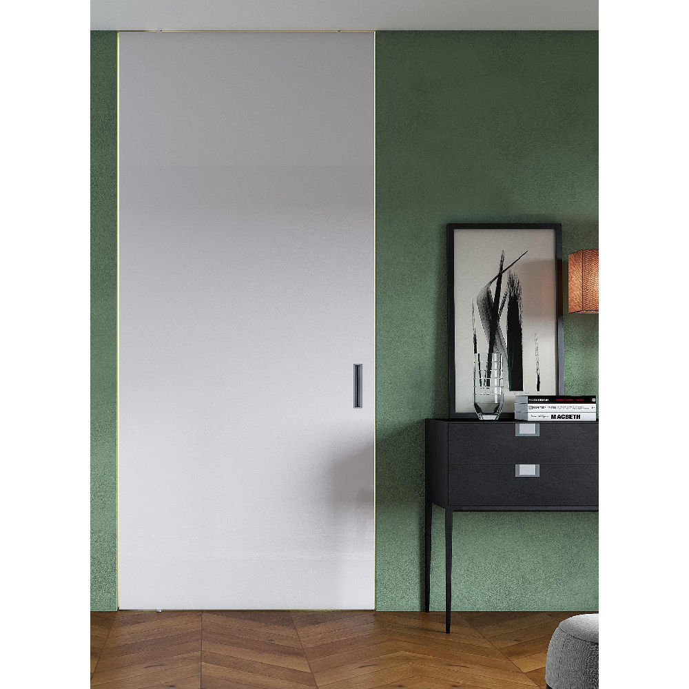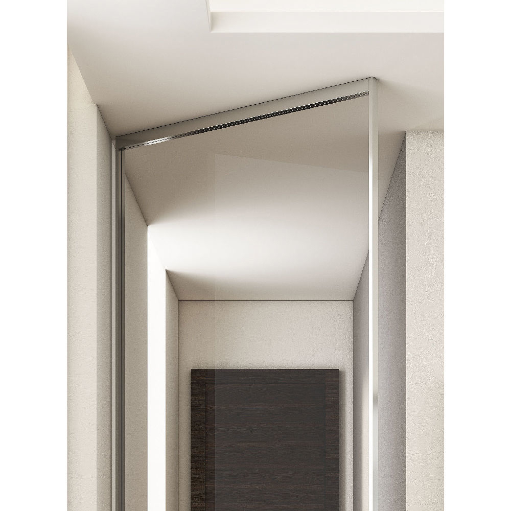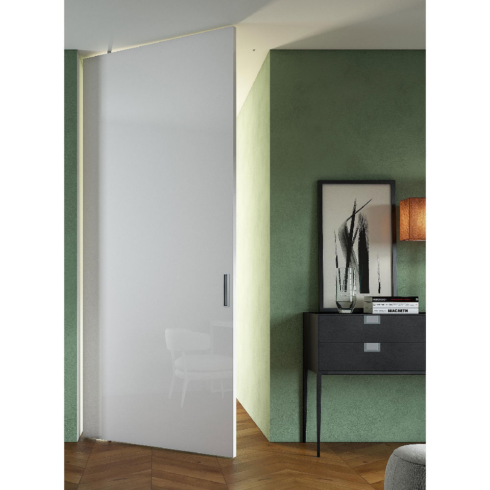The pivoting opening allows the panel to rotate on a decentralized pivot, thanks to a refined concealed system with a soft-closing mechanism. The door is enriched with some anodized aluminum profiles and is composed by a laminated glass thickness 42 mm with squared side panel.