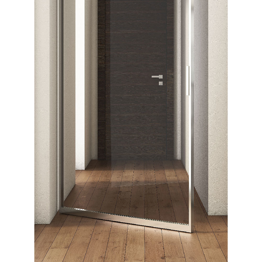 Pivoting door that can open both ways. Pivot opening panel, thickness 42 mm, with aluminum profiles and tempered or laminated safety glass thickness 6 mm. Installation on finished wall. Exclusive vertical handle. Exclusive recessed handle.