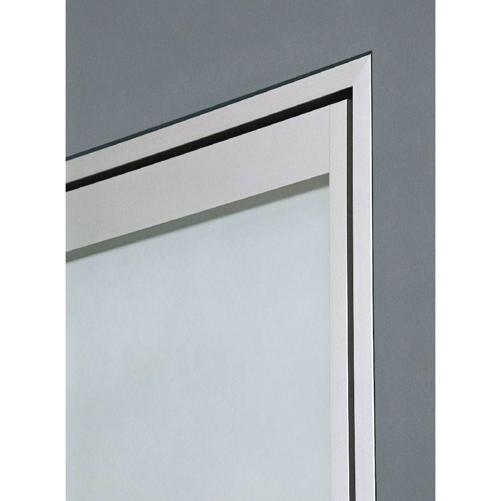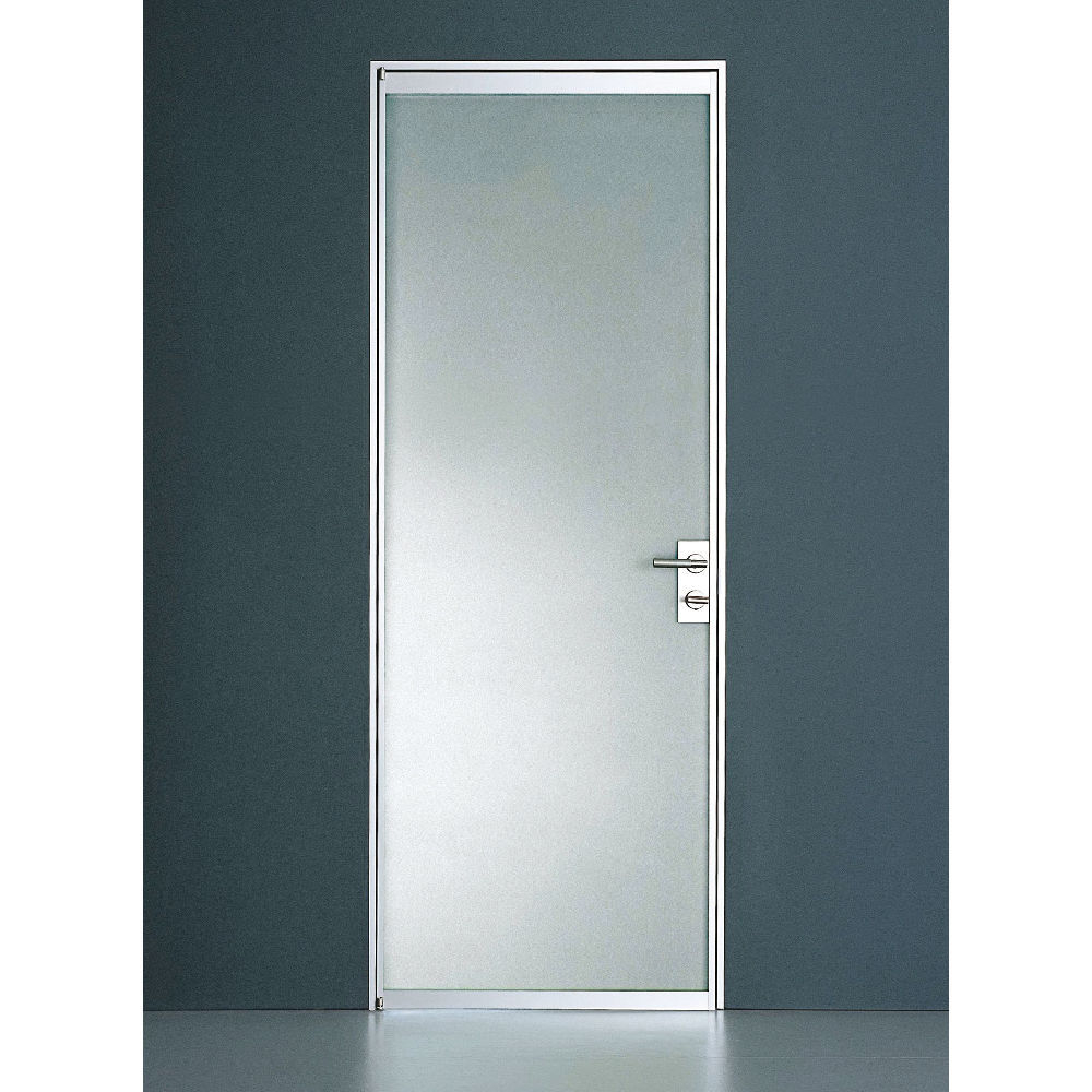 Door flush to the wall, pull side, with specific metal subframe. Swing door thickness 42 mm, plain or glass panel with aluminum profiles and 6 mm tempered or laminated safety glass, jamb with square section. Aluminum frame extending from 85 to 125 mm, plastic gasket, patented hinges and mechanical lock arranged for privacy thumbturn, handle only or cylinder with key.