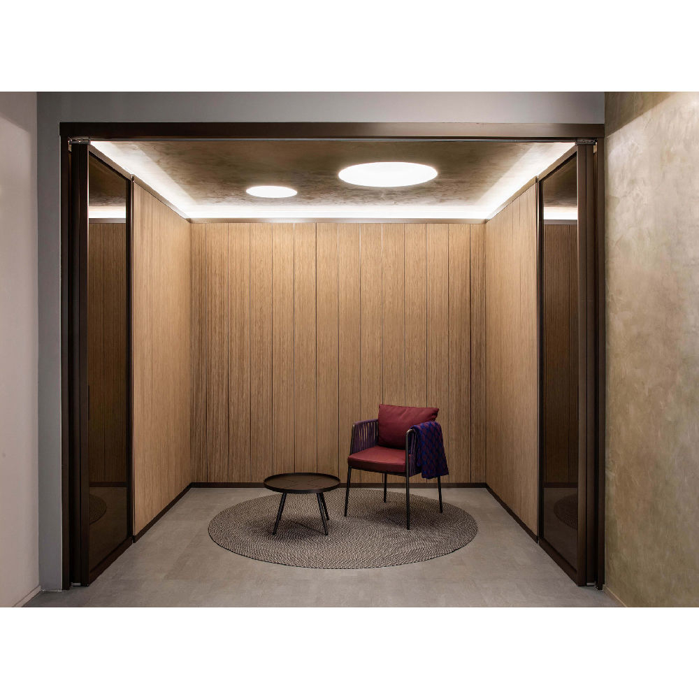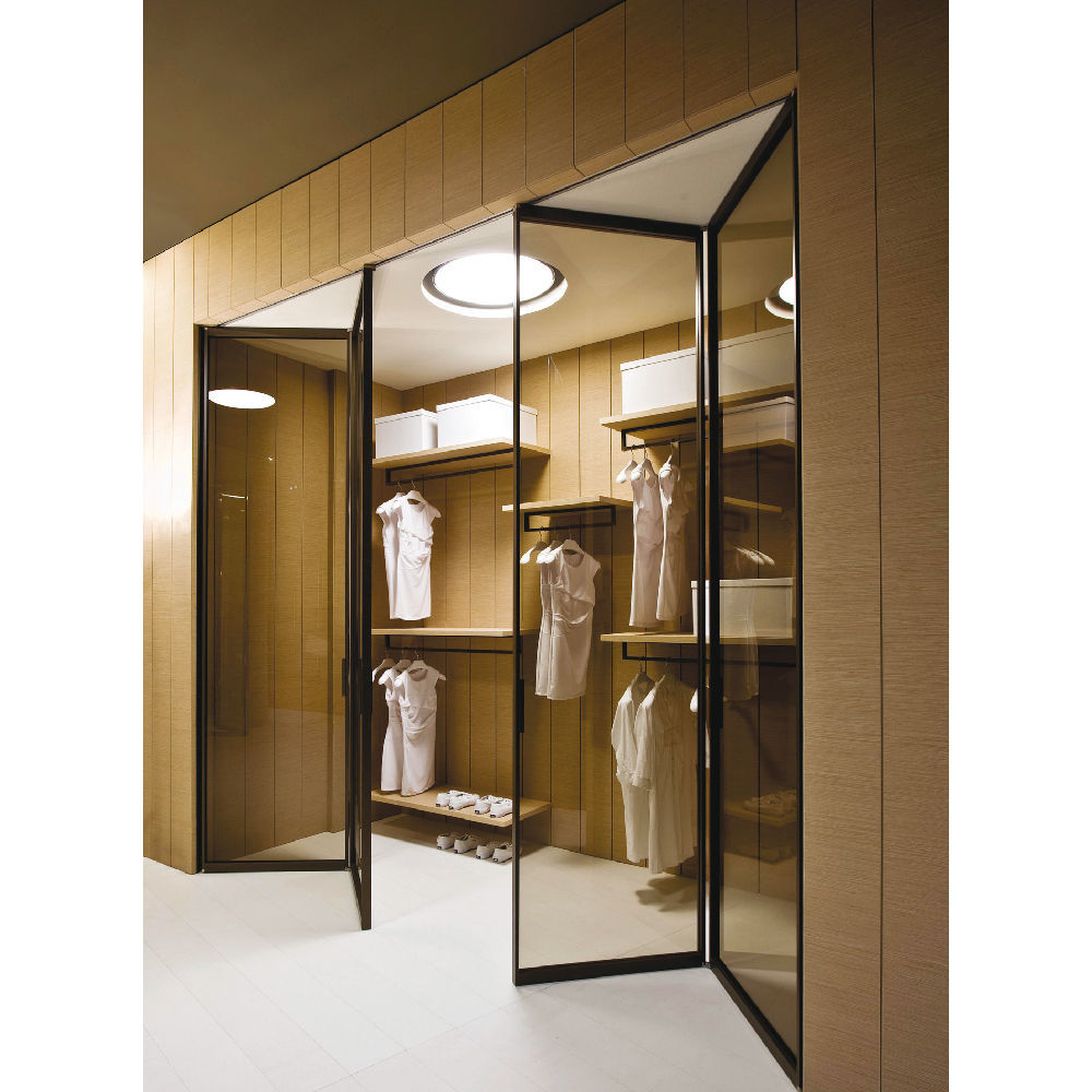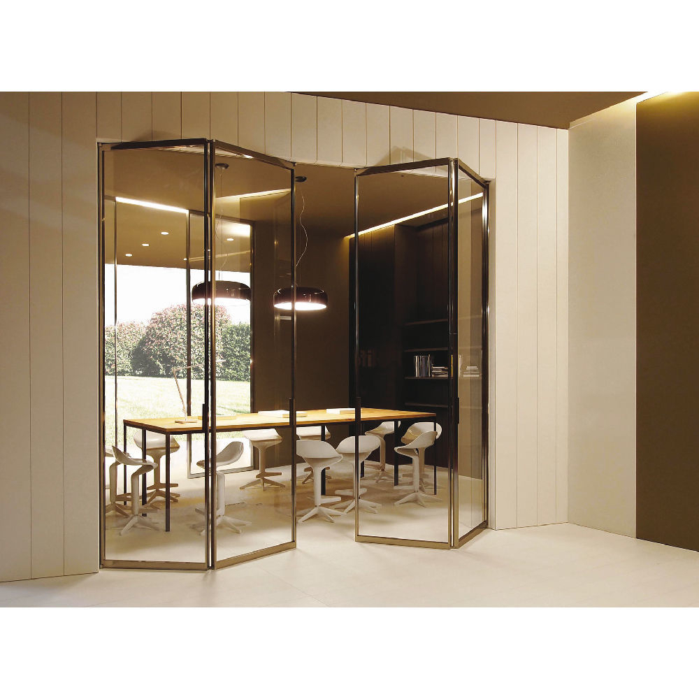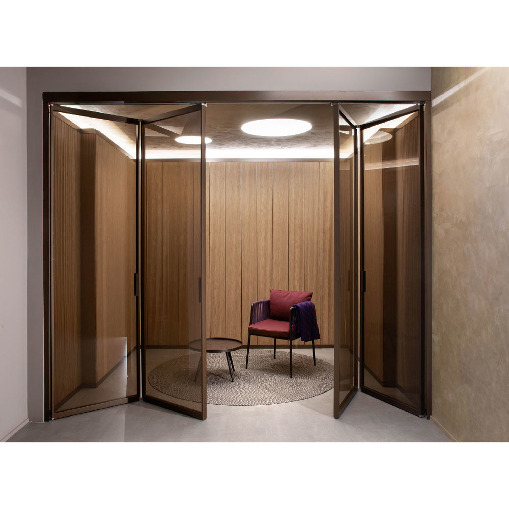 Partition wall system composed of panels with folding opening. Composition available with two or four panels and sliding system with single track. Glass panel with aluminum profiles, 42 mm. thick and 6 mm. thick tempered or laminated safety glass, or solid wood door and dedicated vertical handle. Jamb (hinge side only) in aluminum, gasket in plastic material, patented hinges. Exposed track or built in track for false ceiling with dedicated hardware.