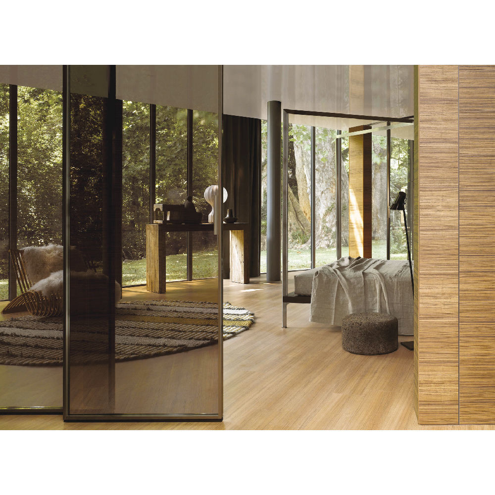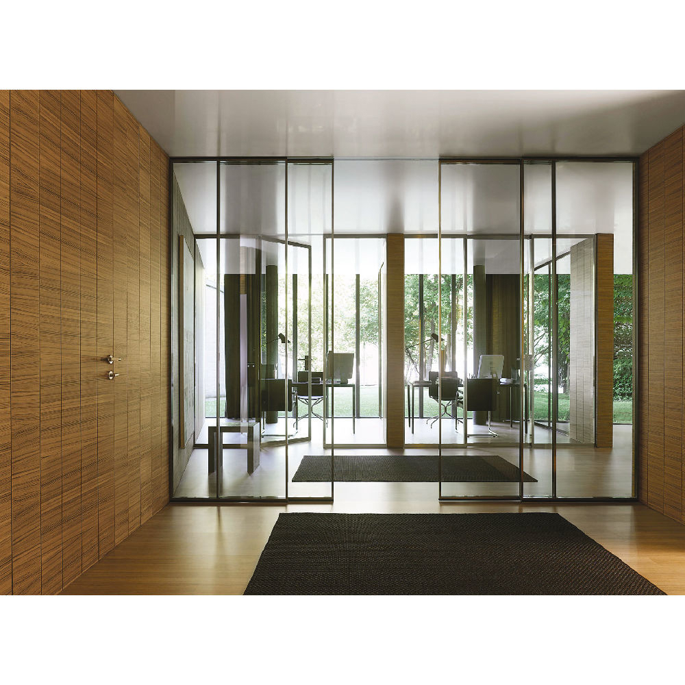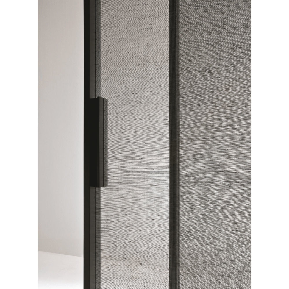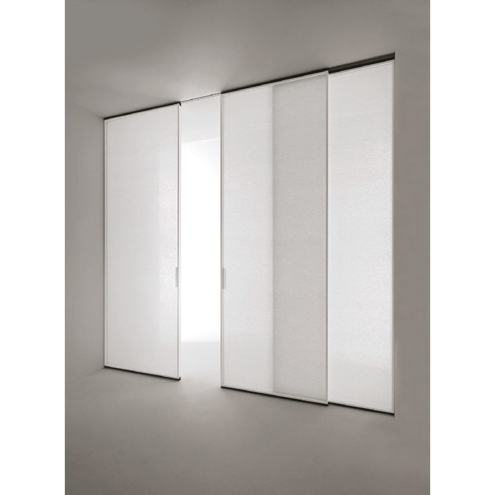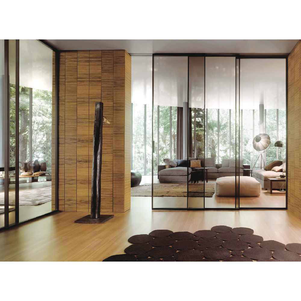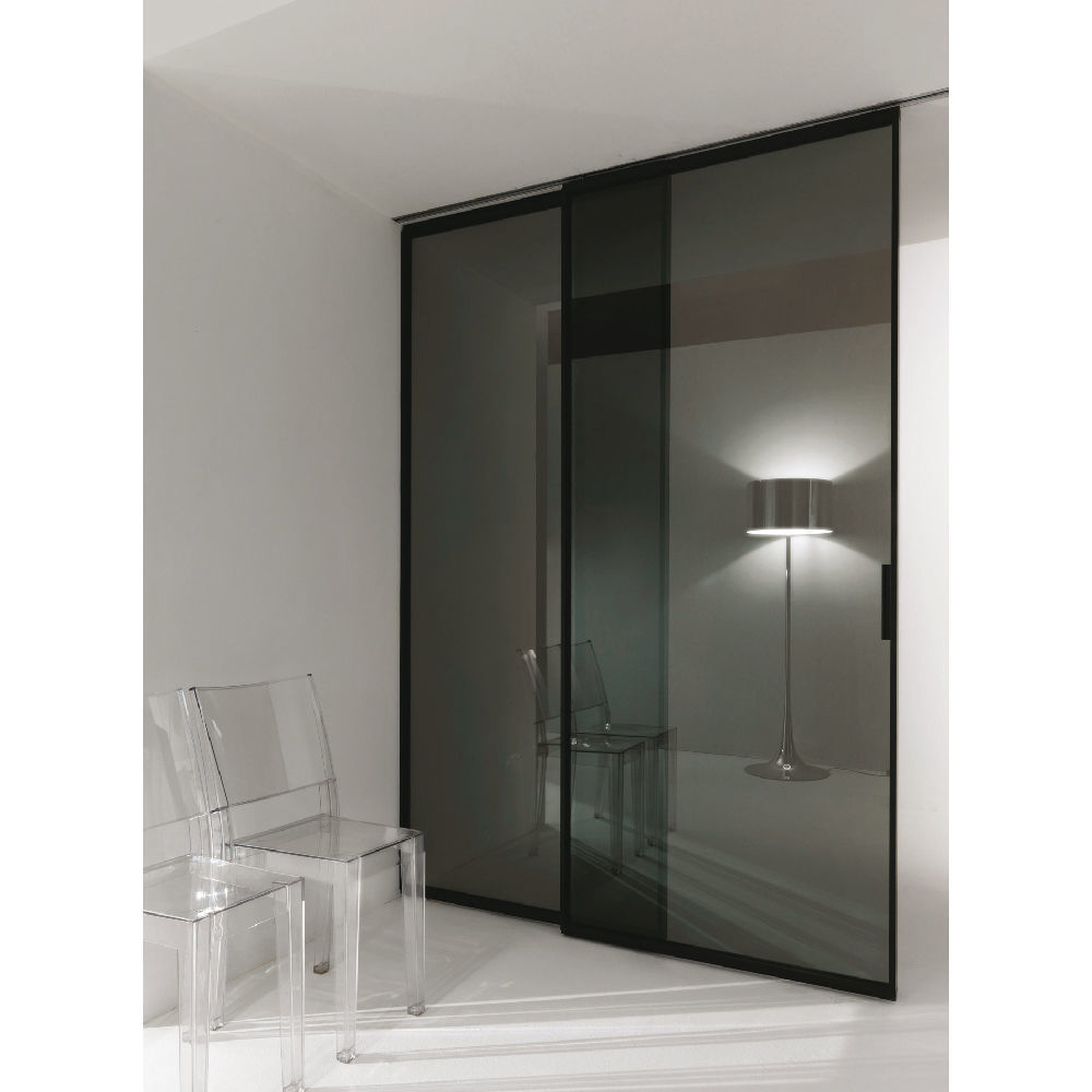 Internal partition composed by single or multiple track fixed to the wall or ceiling. Sliding panel profiles thickness 42 mm and tempered or stratified (laminated) glass thickness 6 mm, dedicated vertical handle. Fixed panel profiles thickness 42 mm and tempered or laminated glass thickness 6 mm. Visible track or recessed track for gypsum with patented ‘soft-closing’ mechanism.