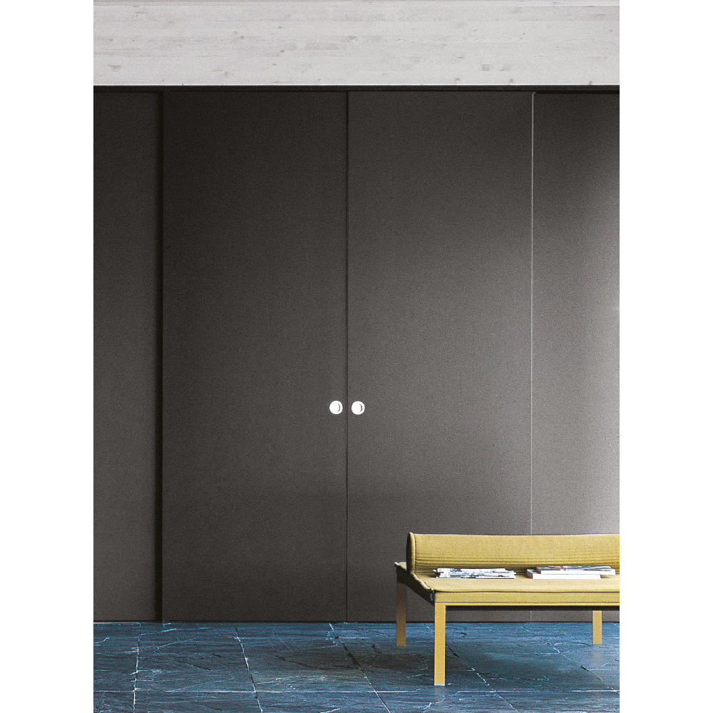 Internal partition composed by single or multiple track fixed to the wall or ceiling. Sliding timbered panel thickness 42 mm., standard predisposition for round handle. Fixed timbered panel thickness 42 mm. Visible track or recessed track for gypsum with patented “soft-closing” mechanism.