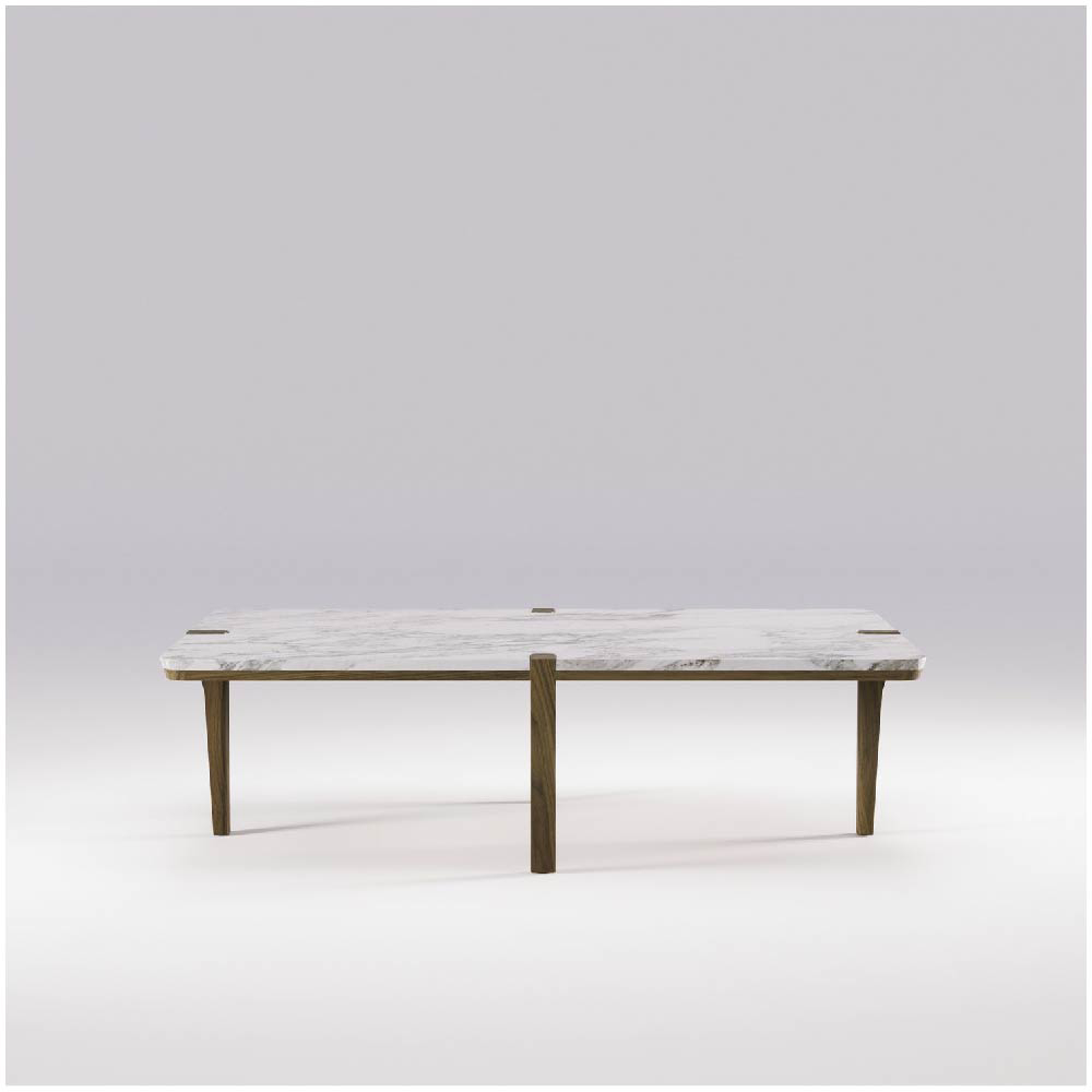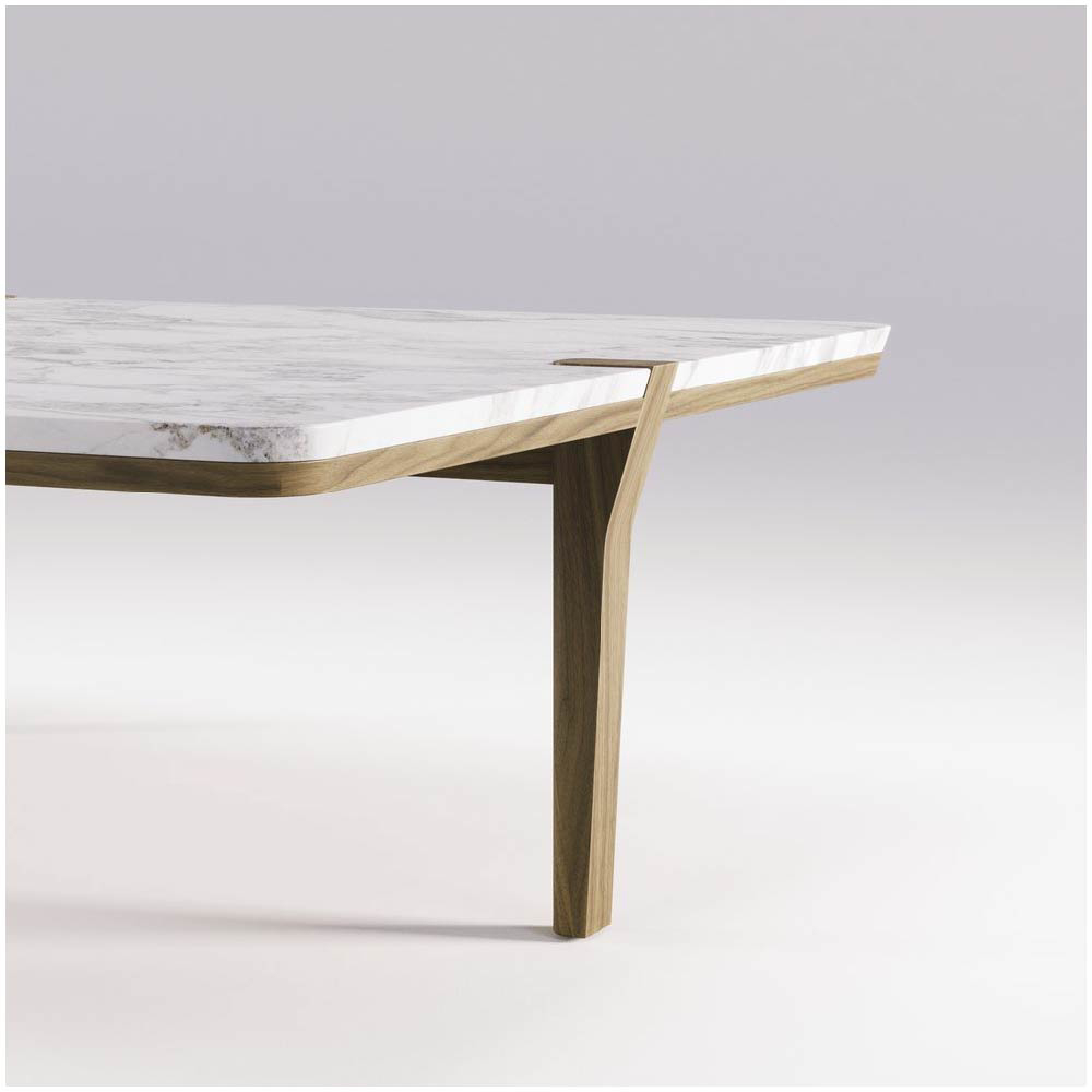A key feature of the Corner tables is the meticulous assembly detail that can be found in both its rectangular and round versions. This connection between the foot and the top of the table accentuates the contrast between the smooth, polished marble and the solid wood, highlighting the craftsmanship and structural integrity of the piece. The blending of these materials adds a rich texture to the design, creating a striking visual contrast that enhances its overall elegance and presence.