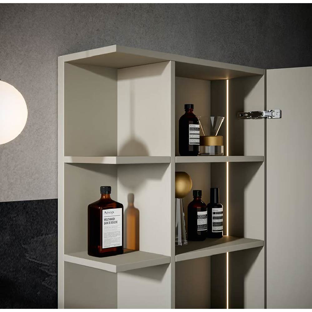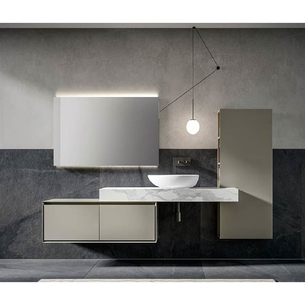 The structure with 45° cut that frames the units is the distinctive trait of this collection: the front looks as if it is suspended, enclosed inside the space drawn by the perimeter that frames it. Customisable in all Edoné colours, it is also possible to add a thin perimeter to further enrich and give the vanity units an even more distinctive look.