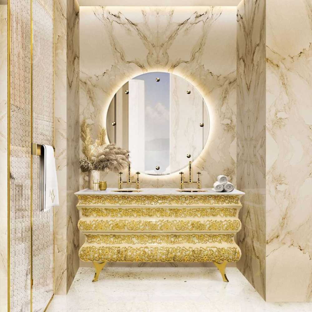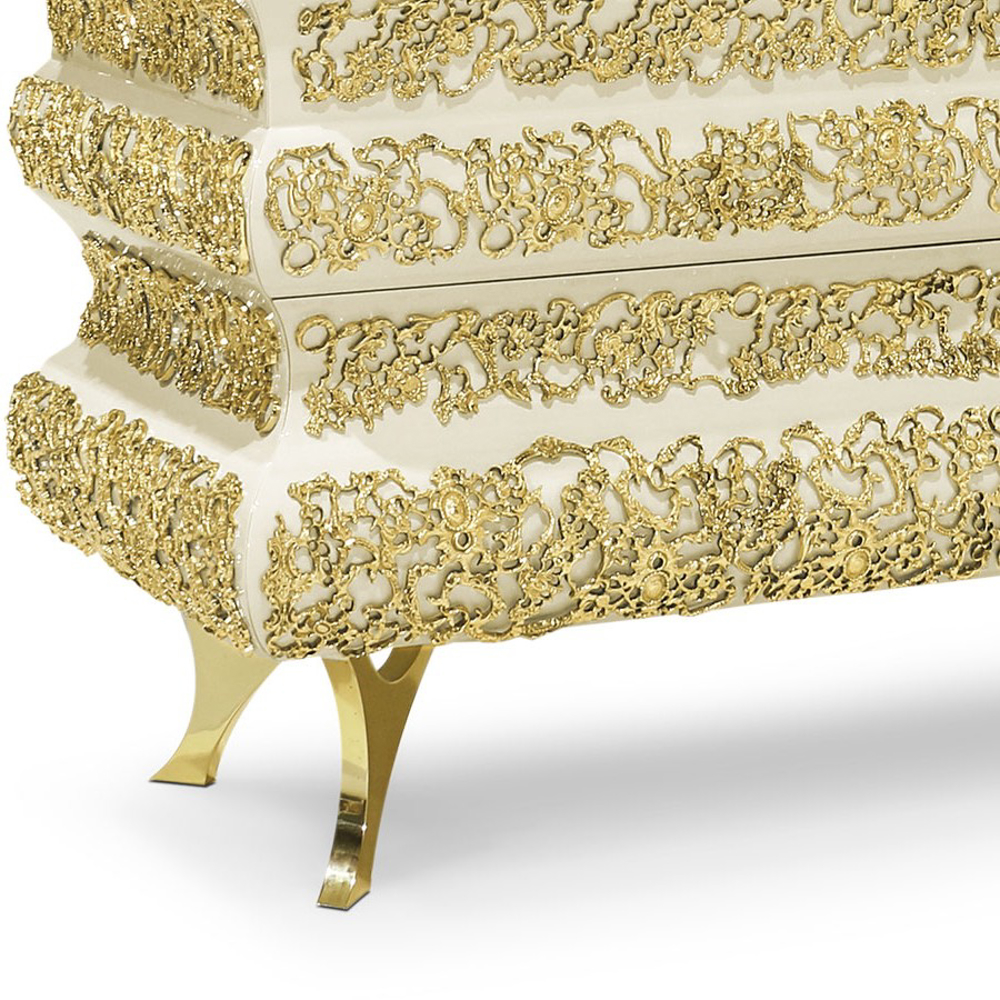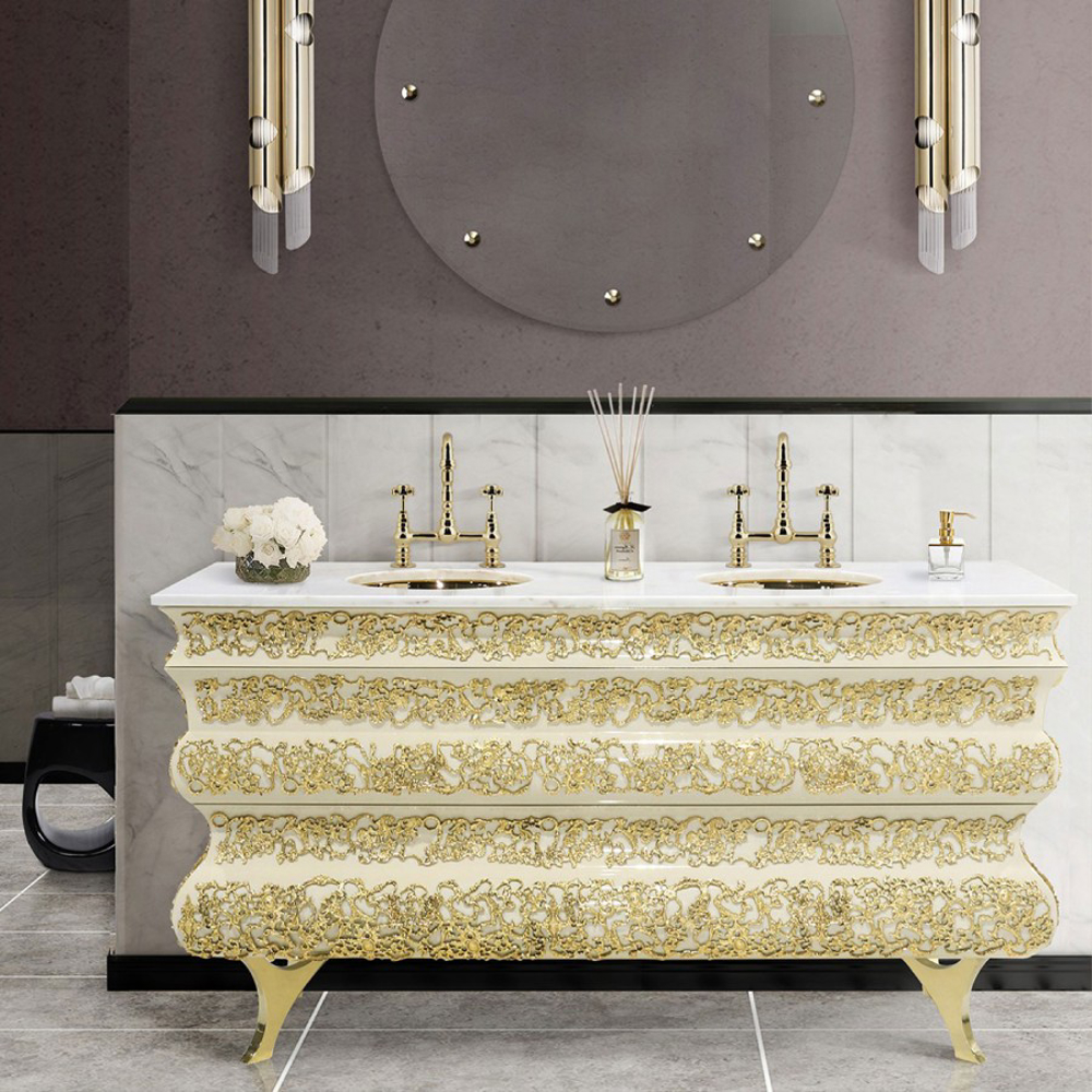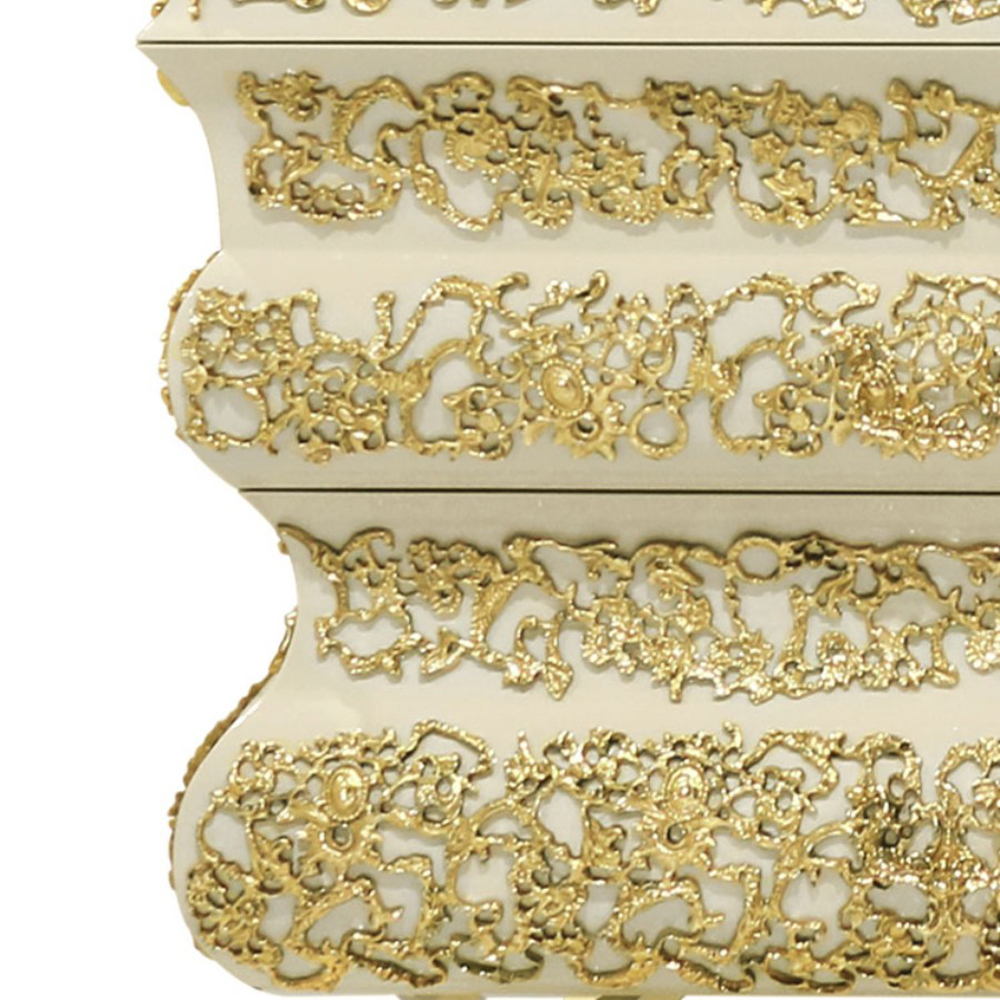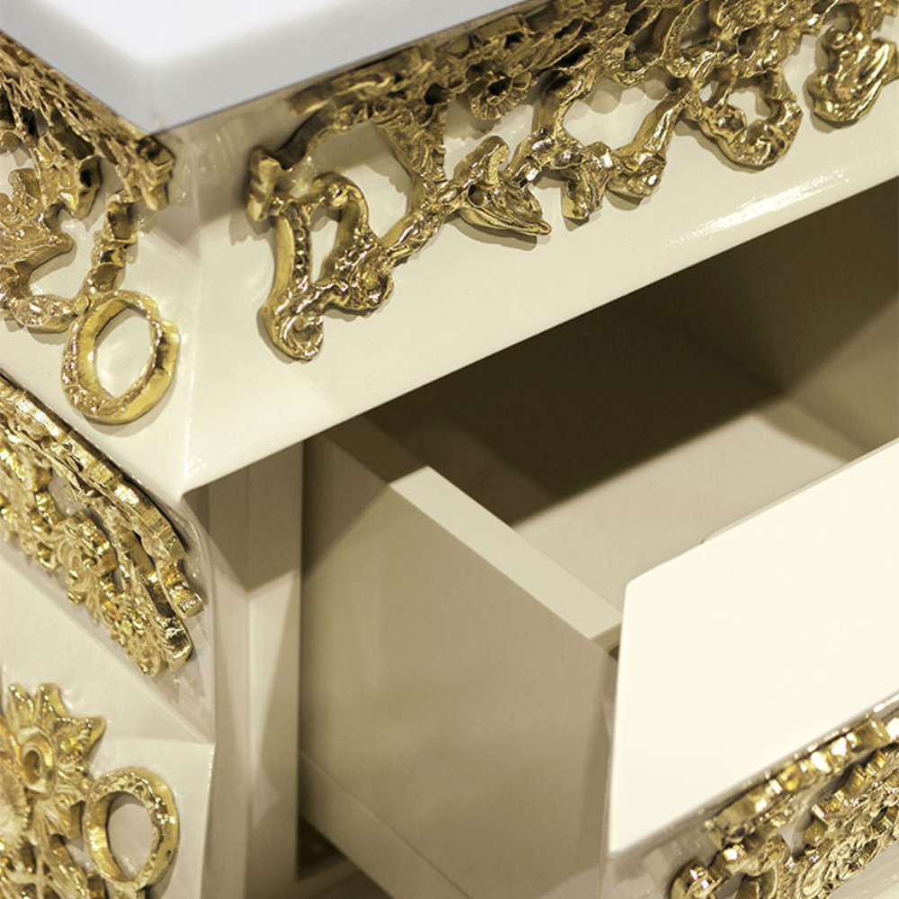 Structure: Glossy White-Cream Lacquered Wood | Knitting Polished Brass Details; Top: Estremoz Marble; Feet: French Style Polished Brass, High Gloss Varnish; Sink: Polished Brass, High Gloss Varnish; Water drainage: Wall