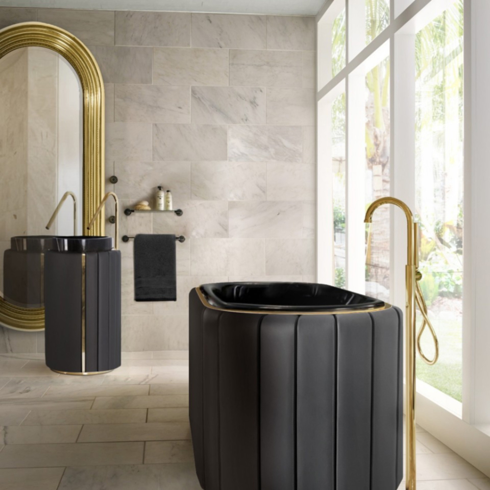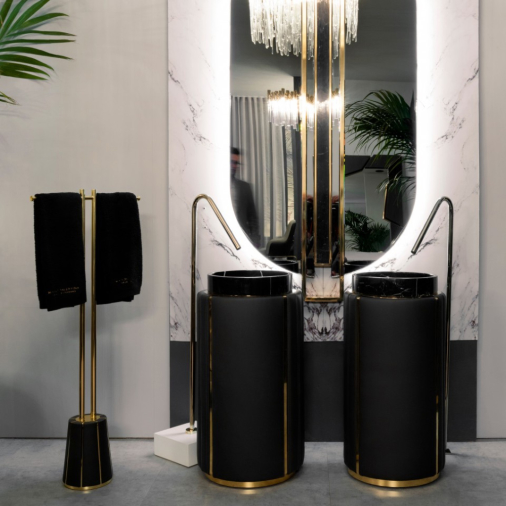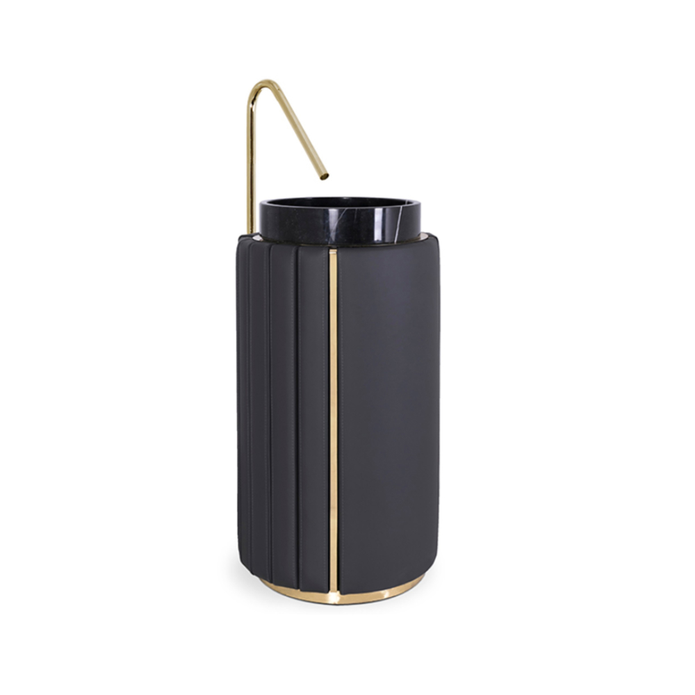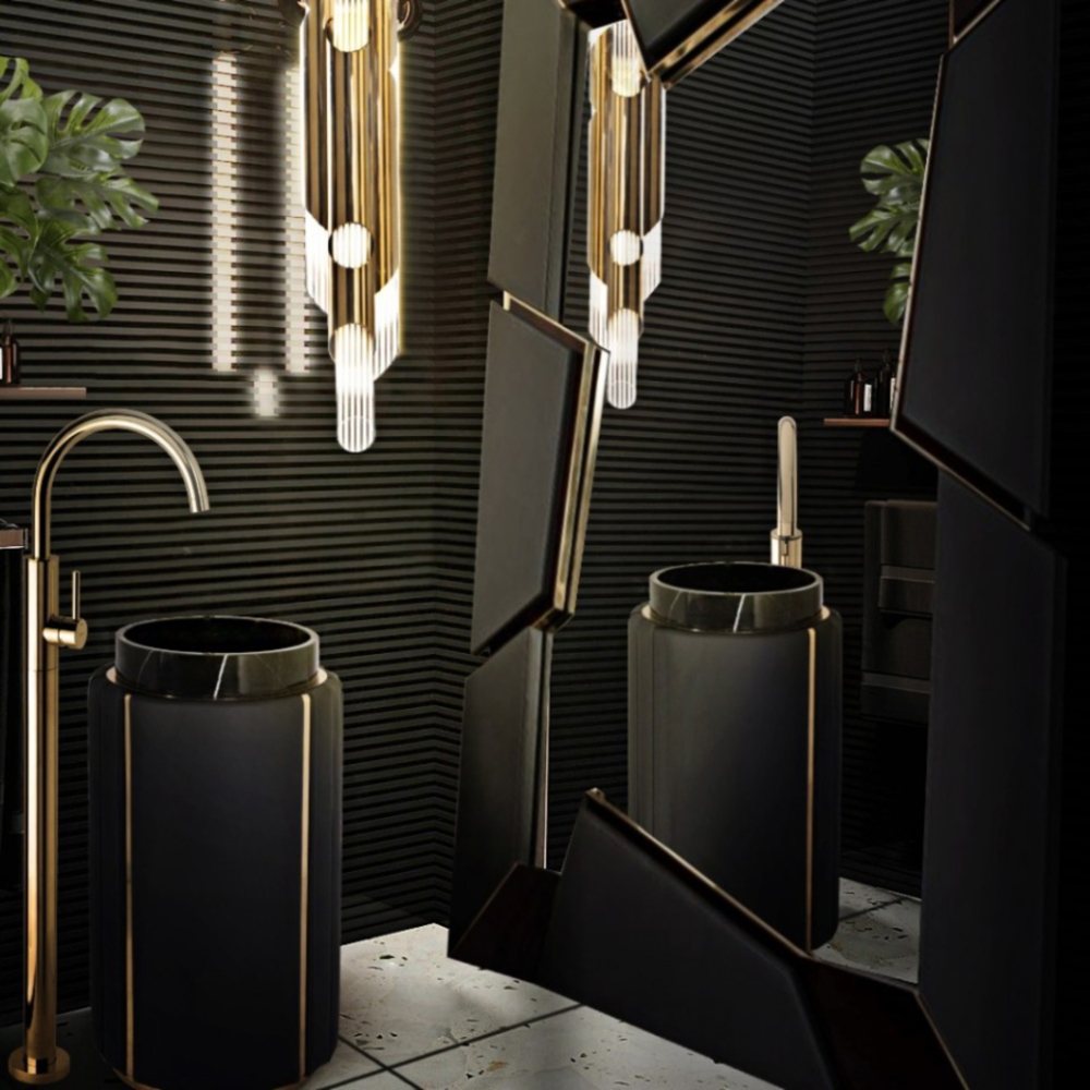 DESCRIPTION The Darian Pedestal Sink draws inspiration from Darius, the great Persian king. A modern freestanding conceived with precise knowledge of production techniques and materials, from metalwork to upholstery. It features an amazingly dazzling cluster of asymmetrical gold-plated brass bars enveloping a black leather structure that will allow for great luxury in your bathroom design.