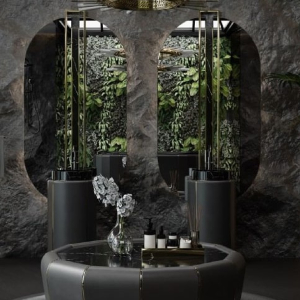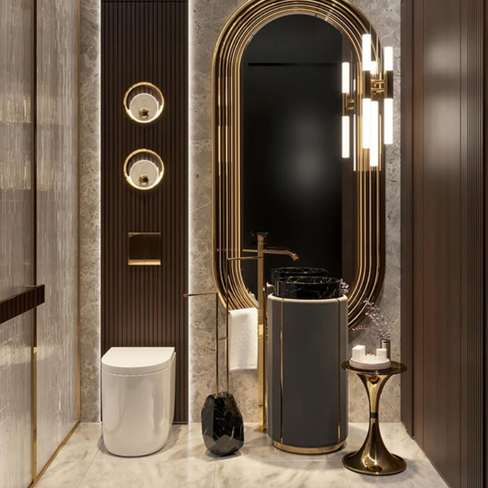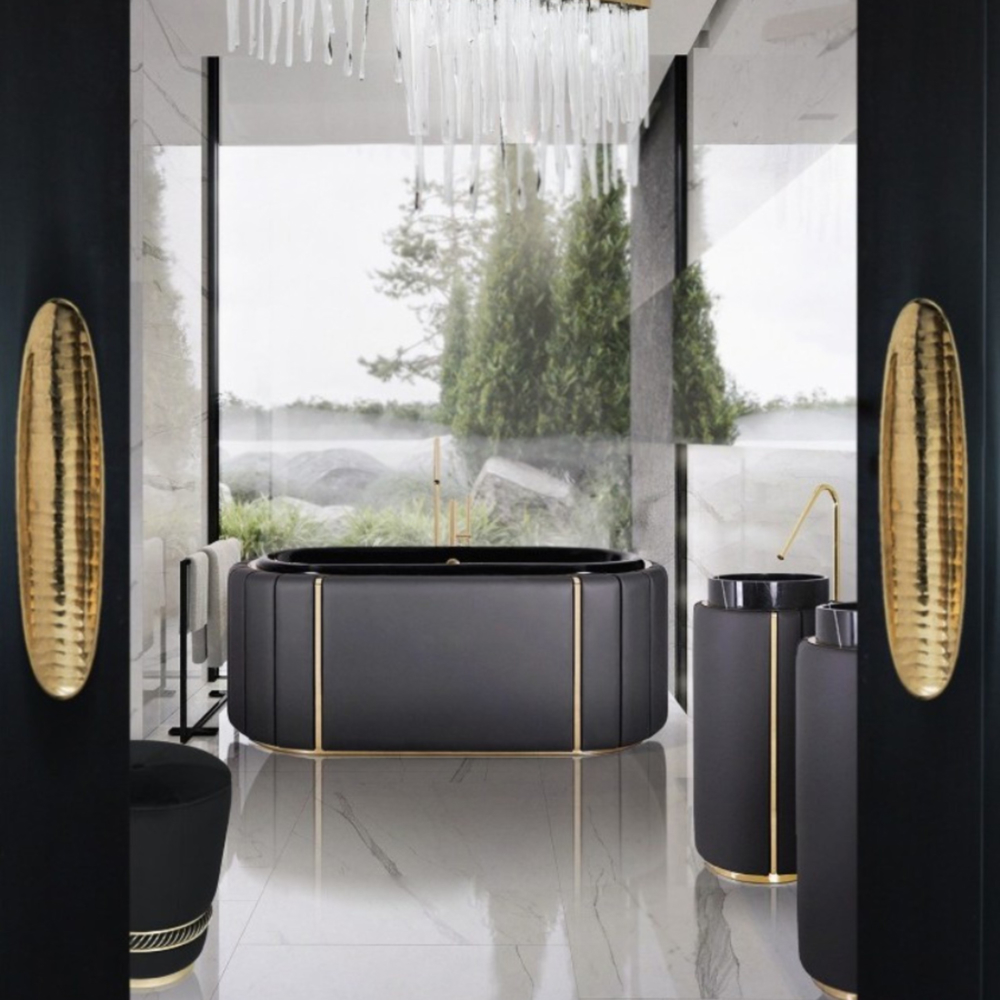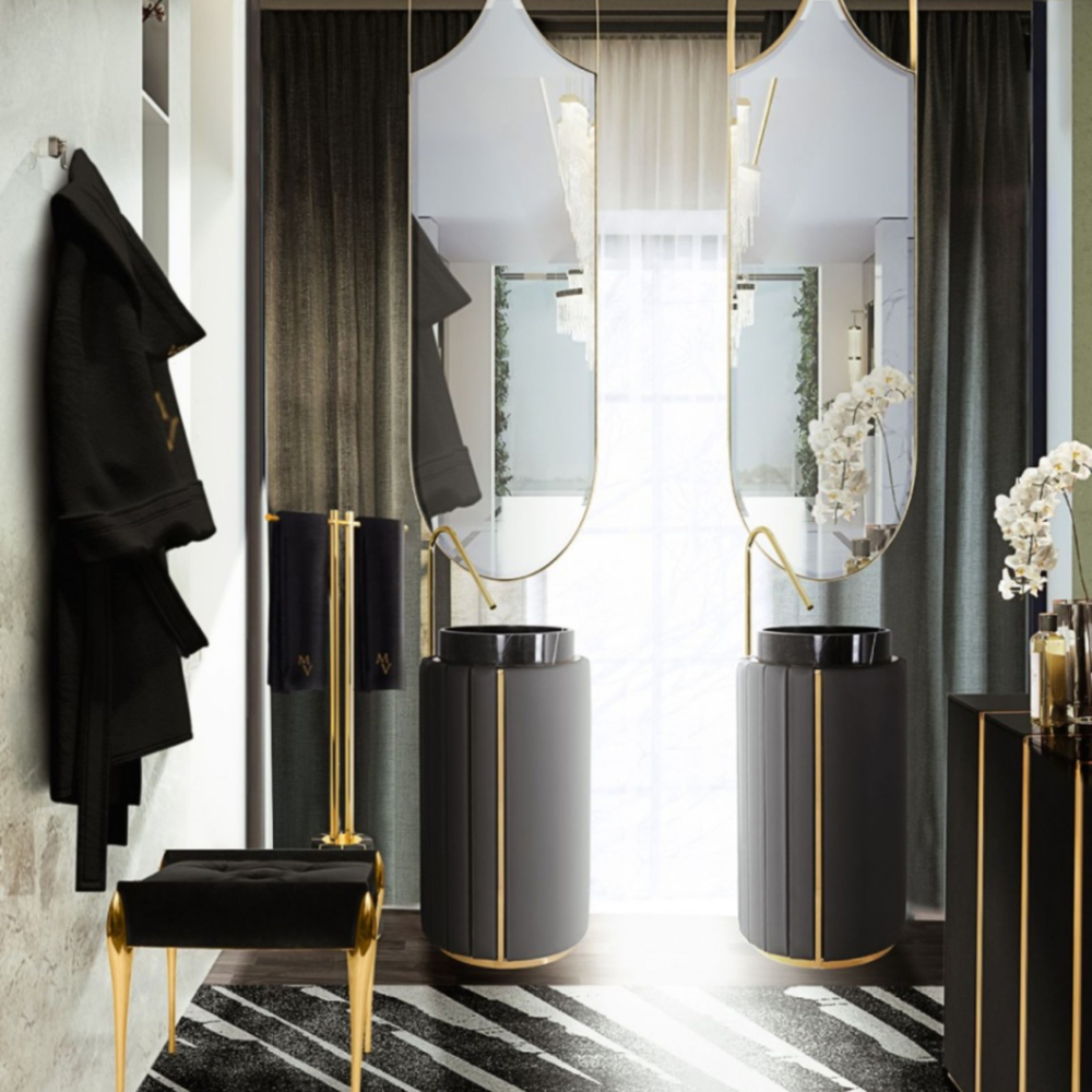 DESCRIPTION The Darian Pedestal Sink draws inspiration from Darius, the great Persian king. A modern freestanding conceived with precise knowledge of production techniques and materials, from metalwork to upholstery. It features an amazingly dazzling cluster of asymmetrical gold-plated brass bars enveloping a black leather structure that will allow for great luxury in your bathroom design.