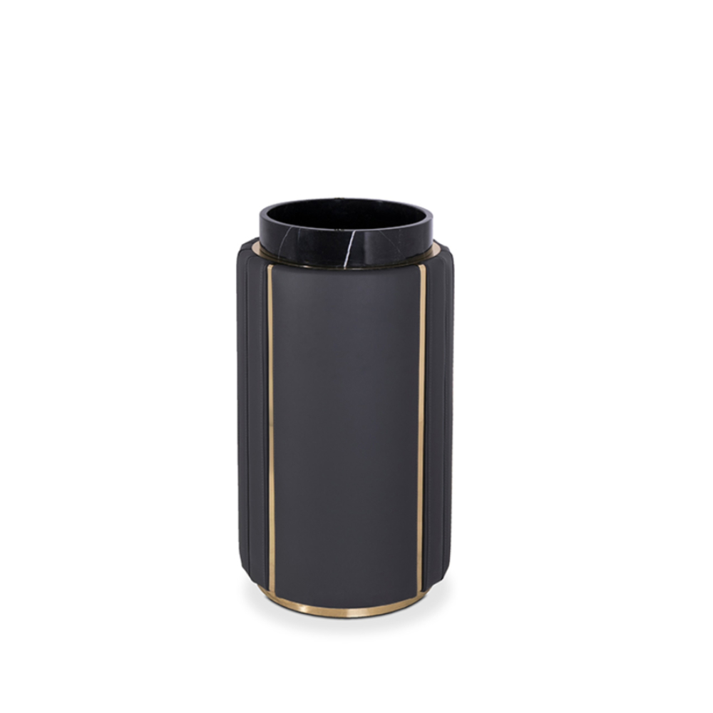 Nero marquina marble, polished brass, black synthetic leather
