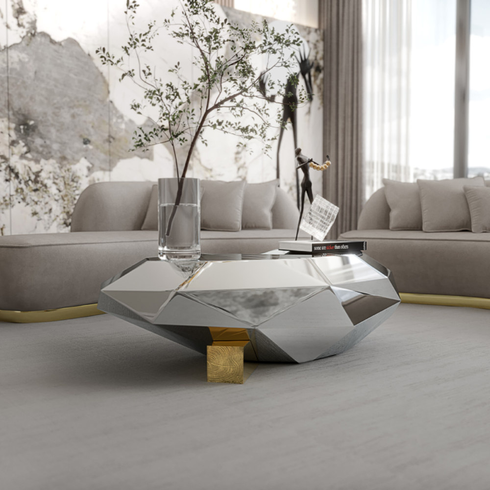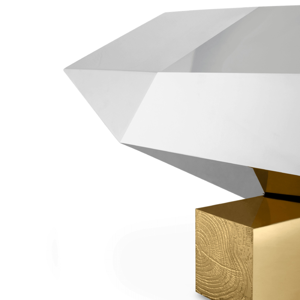 Polished stainless steel. Wood structure. Feets: Polished casted brass.