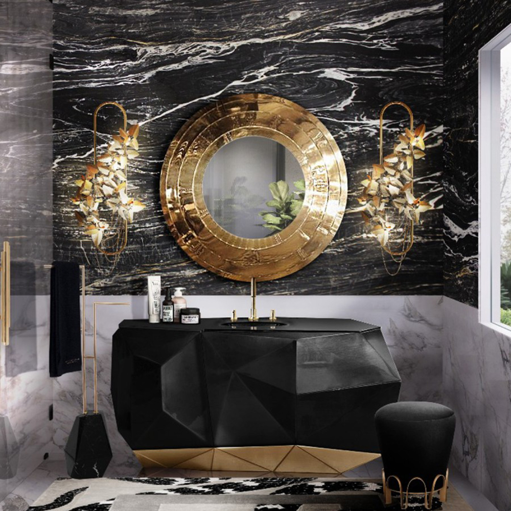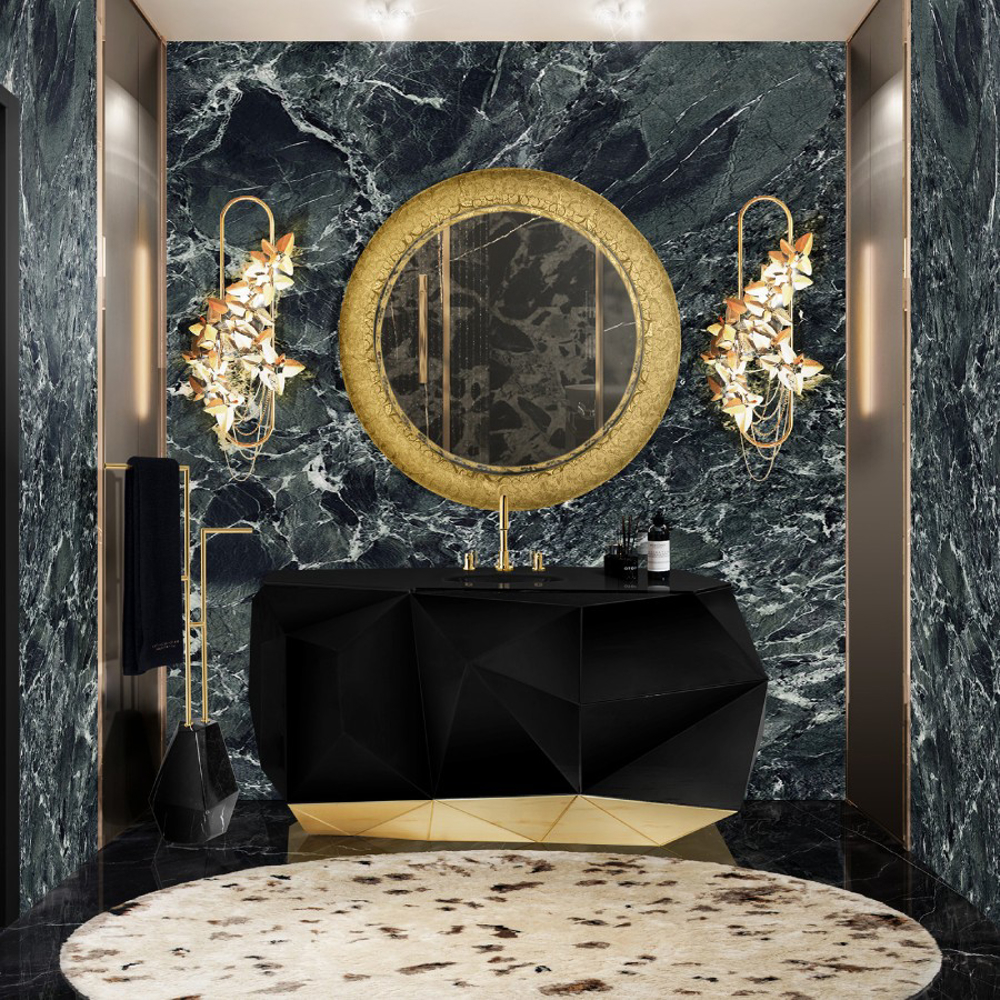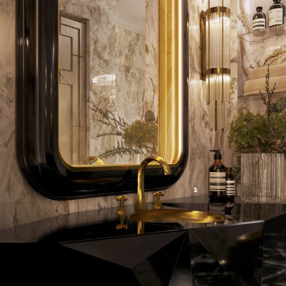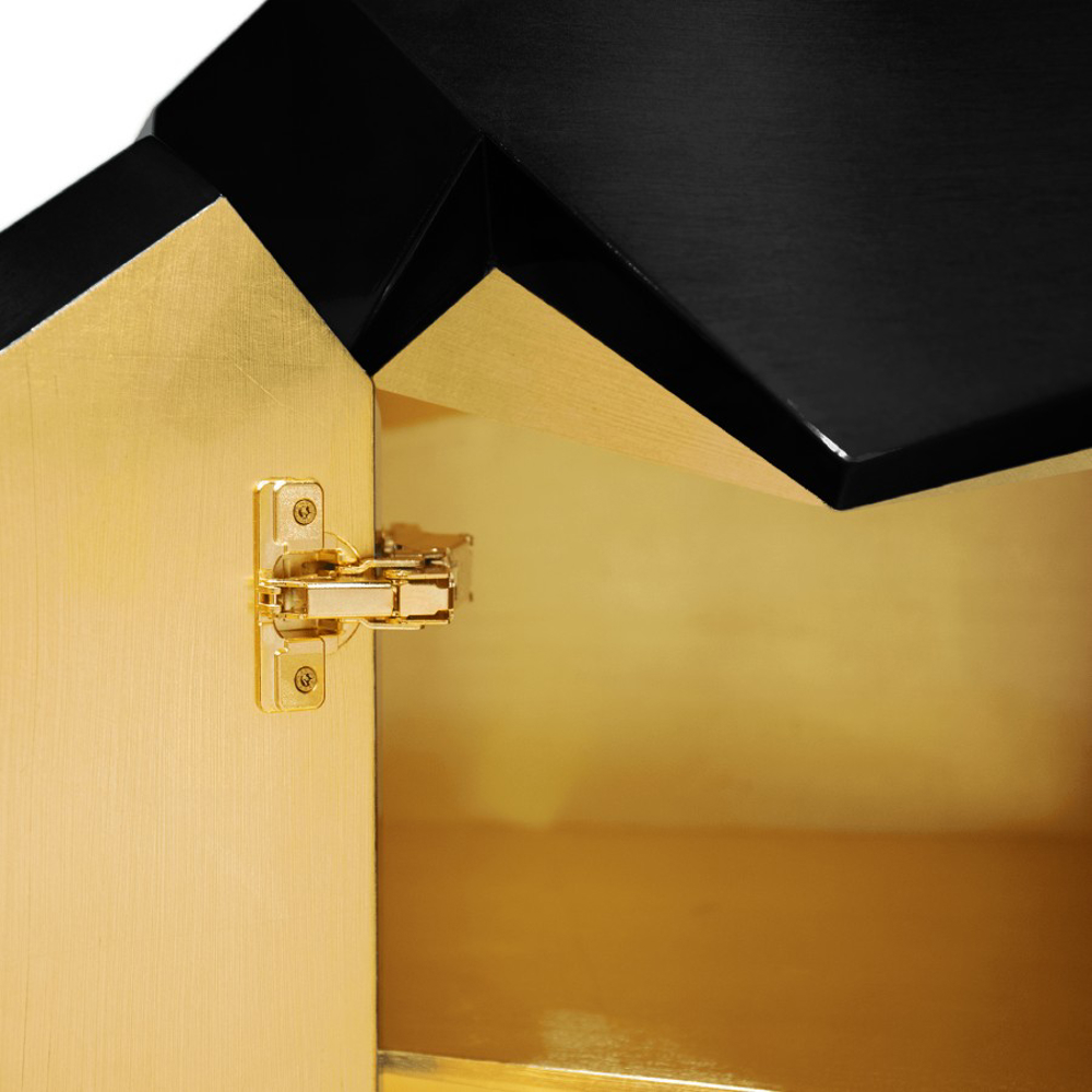 Structure: Wood; Outside: Black lacquered, High gloss varnish; Base/Inside: Gold leaf; Sink/Cover: Black lacquered glass; Water drainage: Wall