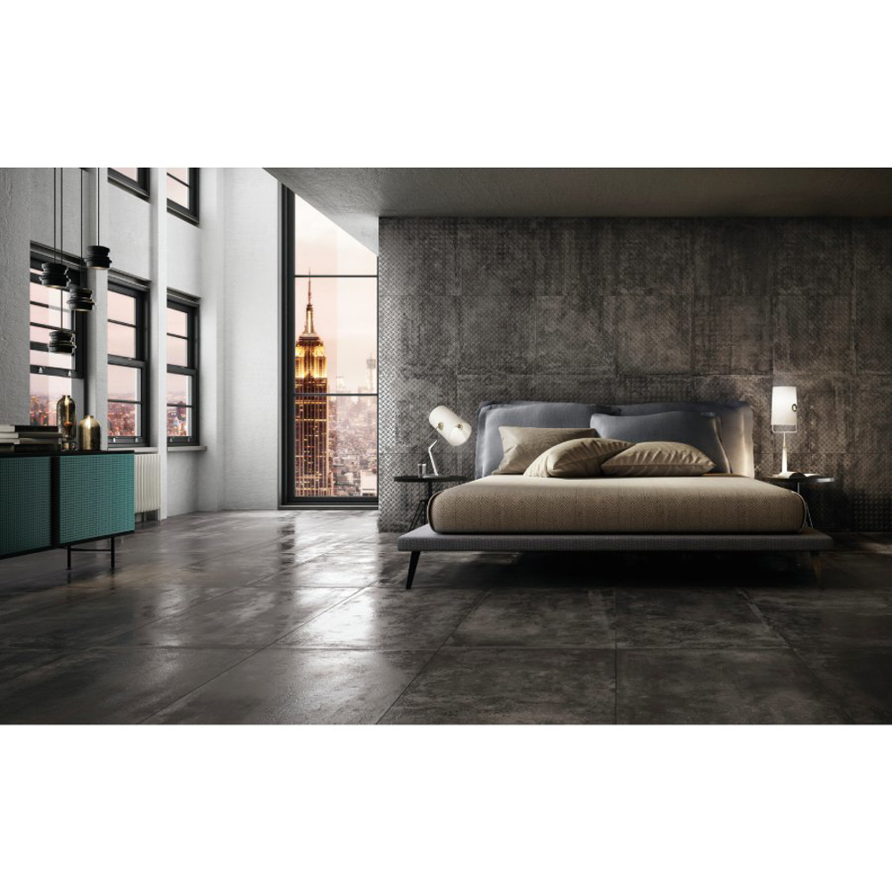 Italian porcelain designer tile by Diesel Living, Stage is a bold reinterpretation of industrial metal, transforming structured, corroded, and dented surfaces into expressive porcelain stoneware. This collection explores the aesthetic potential of metal, translating its textures and imperfections into distinctive, high-performance tiles for floors and walls.