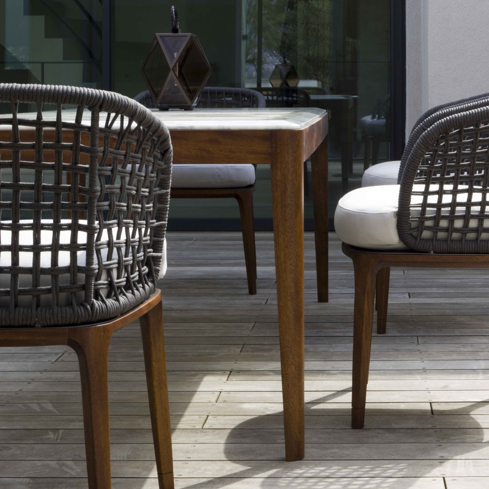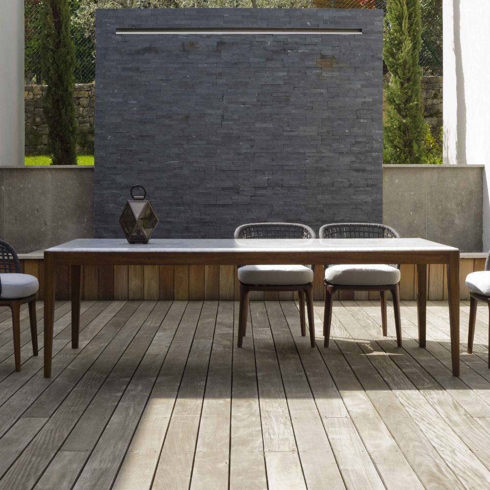 Refined and timeless: Doge is the perfect compendium of clean shapes and balance between proportions and thicknesses. Its four solid wood legs – in Iroko that is a veneer  naturally water resistant, – are flush on the external corners of the table supporting the top which is instead available in stone or back painted glass. Doge table outdoor is available both in rectangular and square version. Its unforgettable detail? The rigour of its clean shape, inseparable from the softness of its details, such as the rounded corners and the shape of the top.