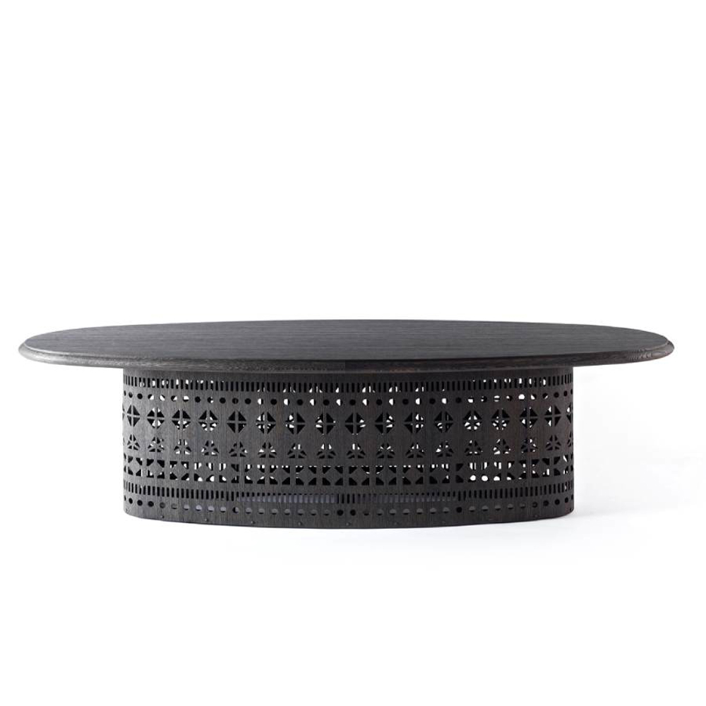 Series of tables, oval or round, characterized by the base made of a single flexible sheet of perforated plywood and then finished by hand. Tops made with a structural countertop in wood, with a rounded edge in solid oak, on which the top in wood or marble is inserted.Â