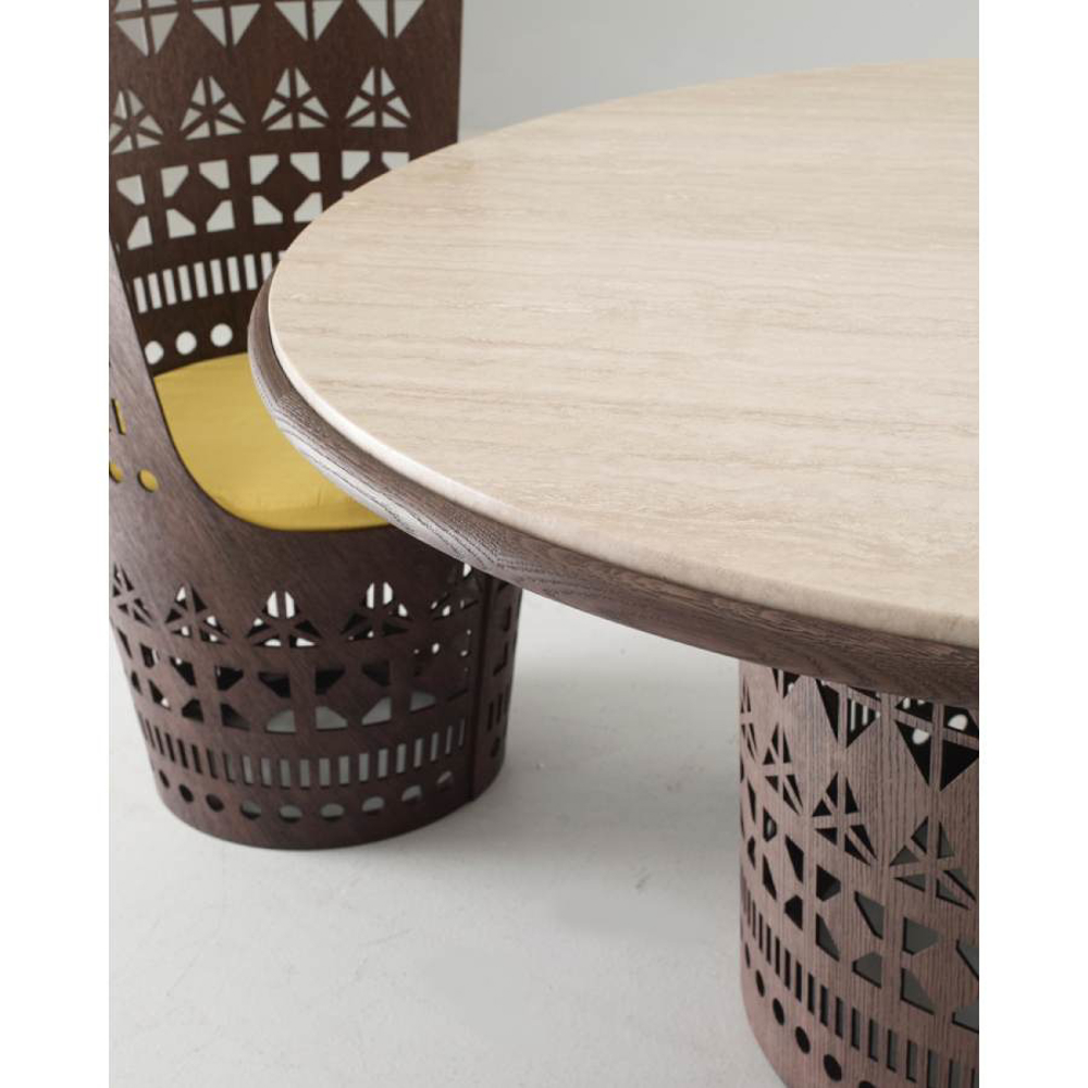 Series of tables, oval or round, characterized by the base made of a single flexible sheet of perforated plywood and then finished by hand. Tops made with a structural countertop in wood, with a rounded edge in solid oak, on which the top in wood or marble is inserted.Â