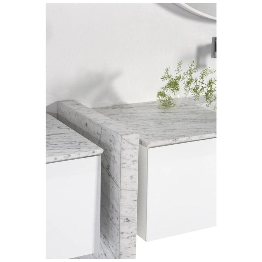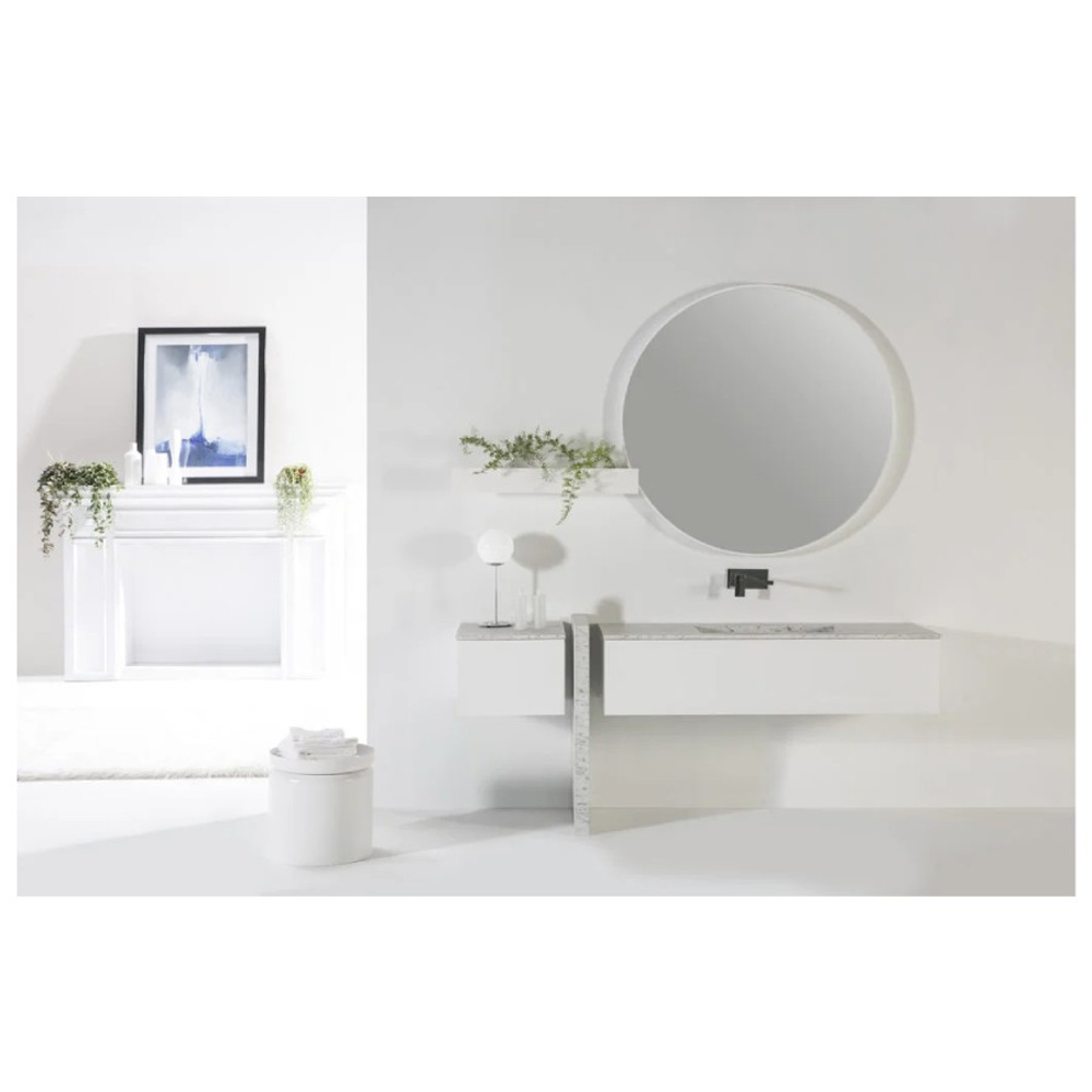 The Edera vanity unit is made of water-repellent MDF. In white lacquered wood inside and out, this bathroom furniture can take on a glossy, satin or matte appearance. Available in four shades, the wall coordinates with the marble sink combined with the Dolom suspended bathroom cabinet.