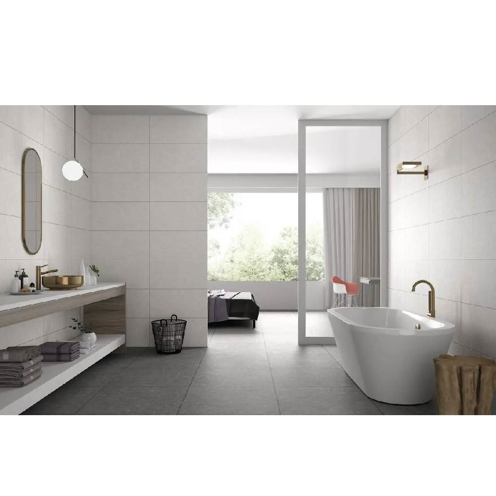 Neutrality and balance A granite-type porcelain tile, with fine and subtle grain, which offers a neutral and balanced surface that avoids overloading.