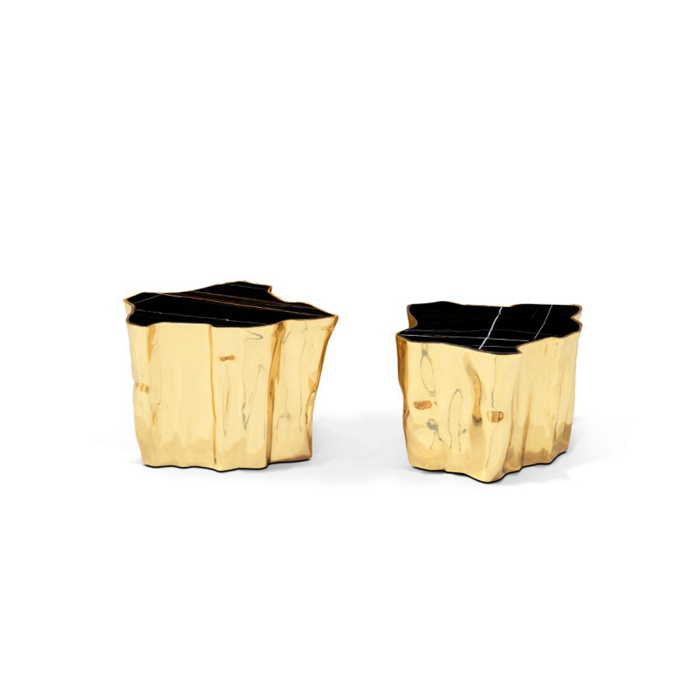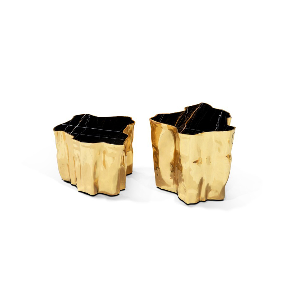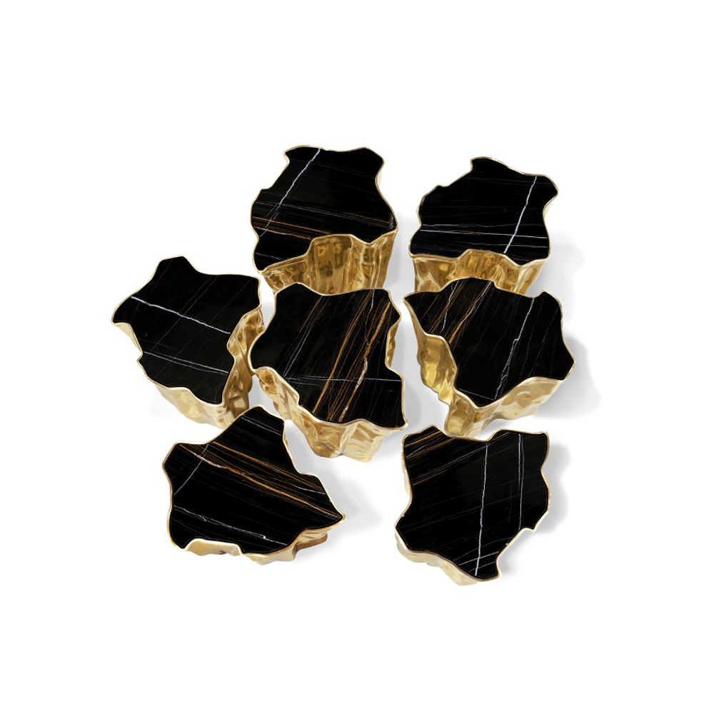 Born from master artisans and the ancient technique of polished cast brass, this statement design pieces incorporate nature-inspired design with industrious welding techniques, being manually assembled, making each piece unique. With delicate lines and bold details, a manually engraved top exposes the heart of a golden tree, boasting a sinuous gold plated base that stood the test of time. It is available in groups of 7, 8 or 14 pieces, with different heights, for unexpected combinations.