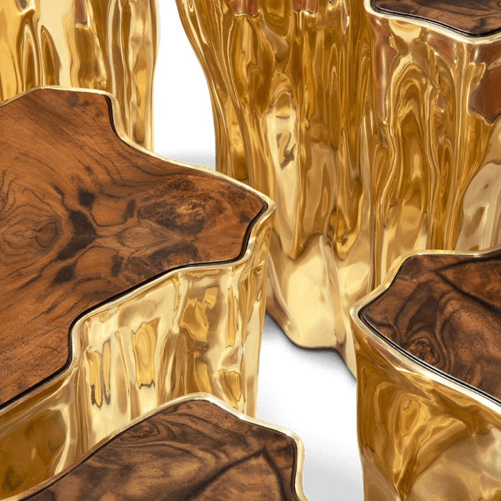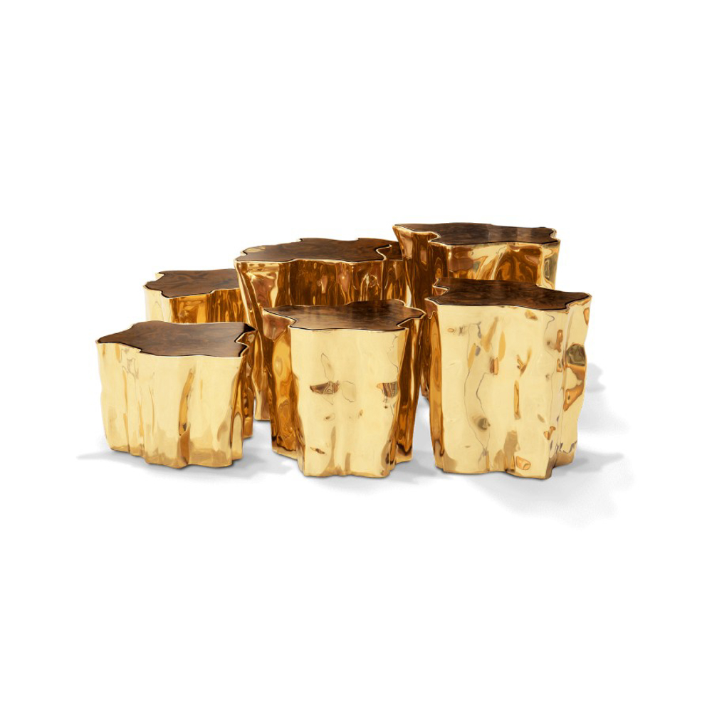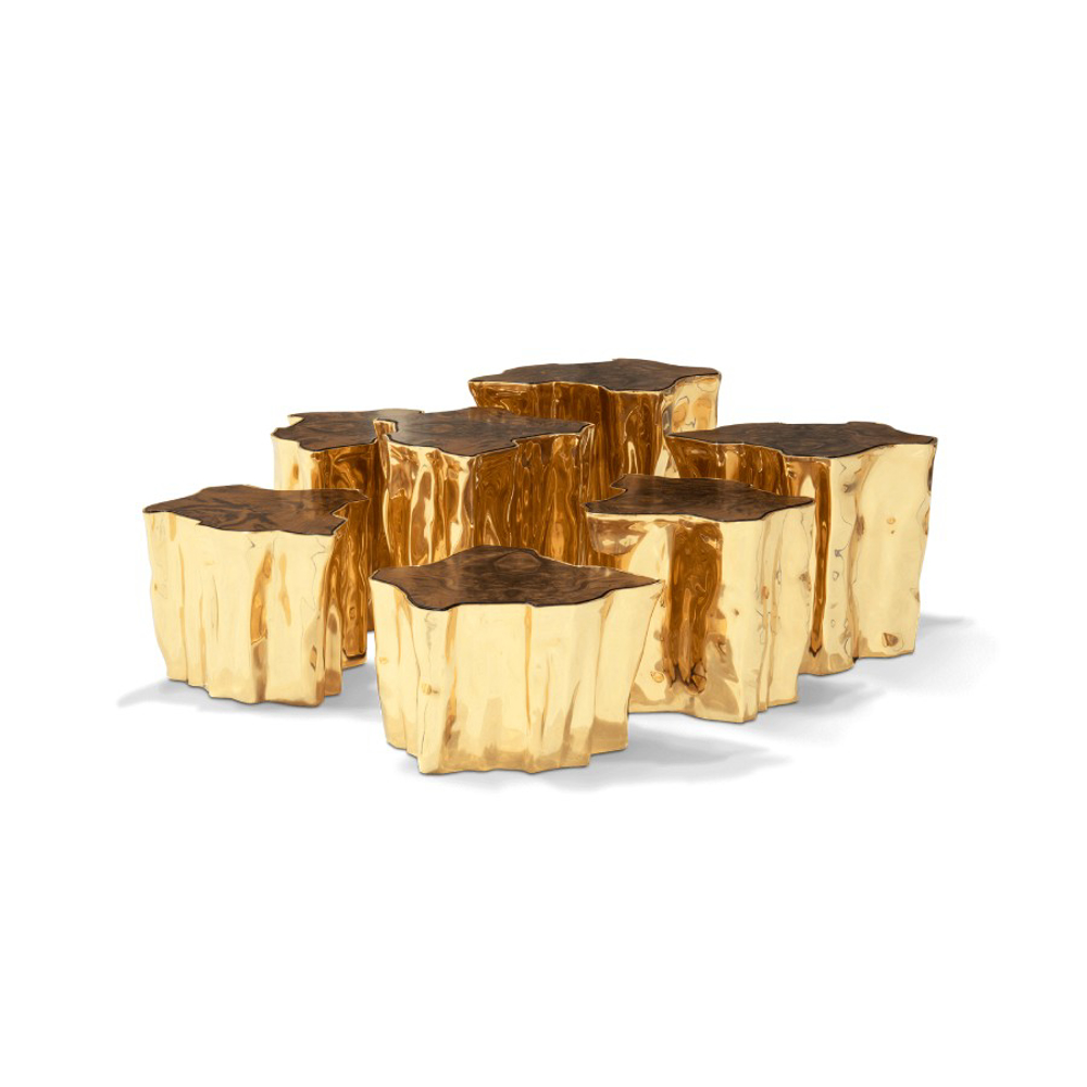 Born from master artisans and the ancient technique of polished cast brass, this statement design pieces incorporate nature-inspired design with industrious welding techniques, being manually assembled, making each piece unique. With delicate lines and bold details, a manually engraved top exposes the heart of a golden tree, boasting a sinuous gold plated base that stood the test of time. It is available in groups of 7, 8 or 14 pieces, with different heights, for unexpected combinations.