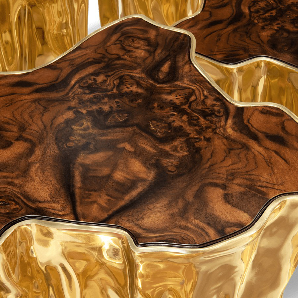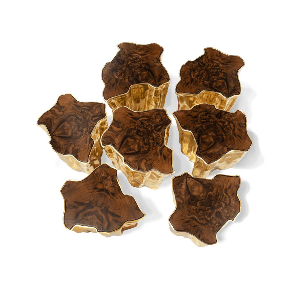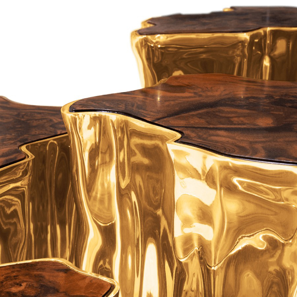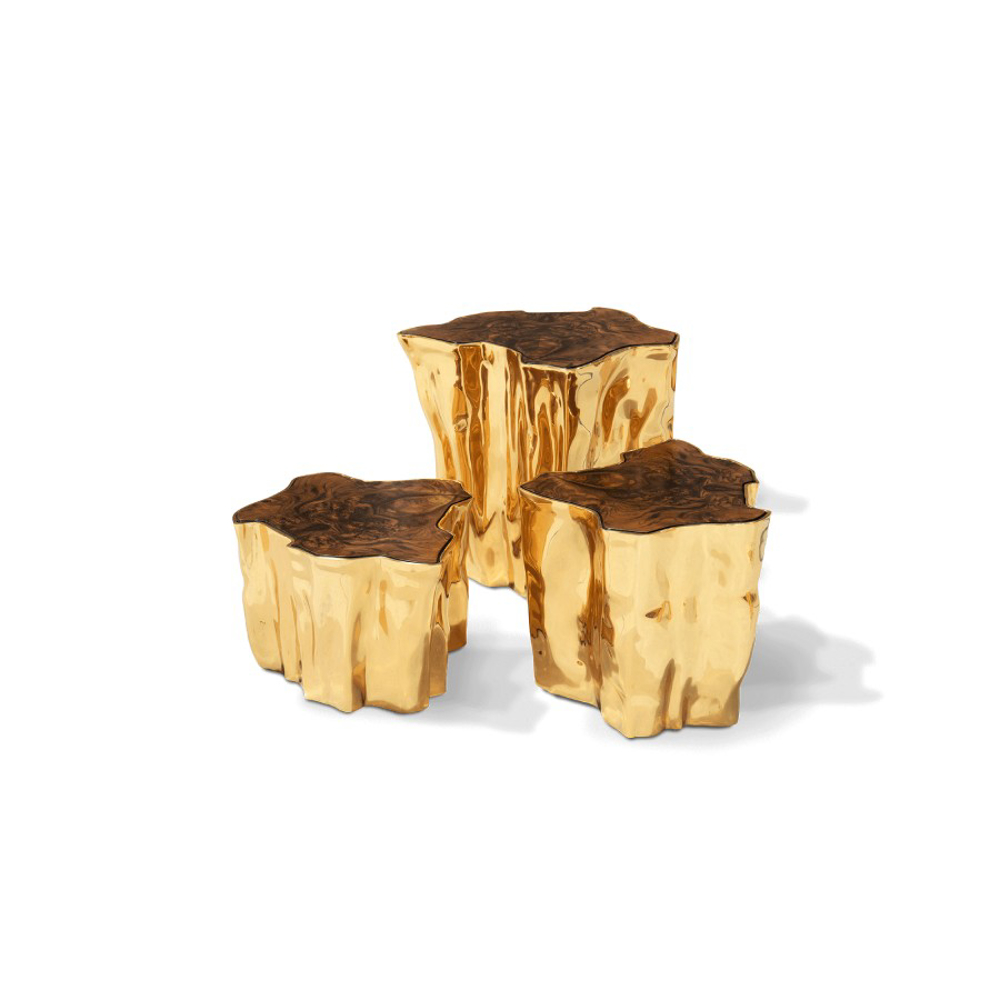 Born from master artisans and the ancient technique of polished cast brass, this statement design pieces incorporate nature-inspired design with industrious welding techniques, being manually assembled, making each piece unique. With delicate lines and bold details, a manually engraved top exposes the heart of a golden tree, boasting a sinuous gold plated base that stood the test of time. It is available in groups of 7, 8 or 14 pieces, with different heights, for unexpected combinations.