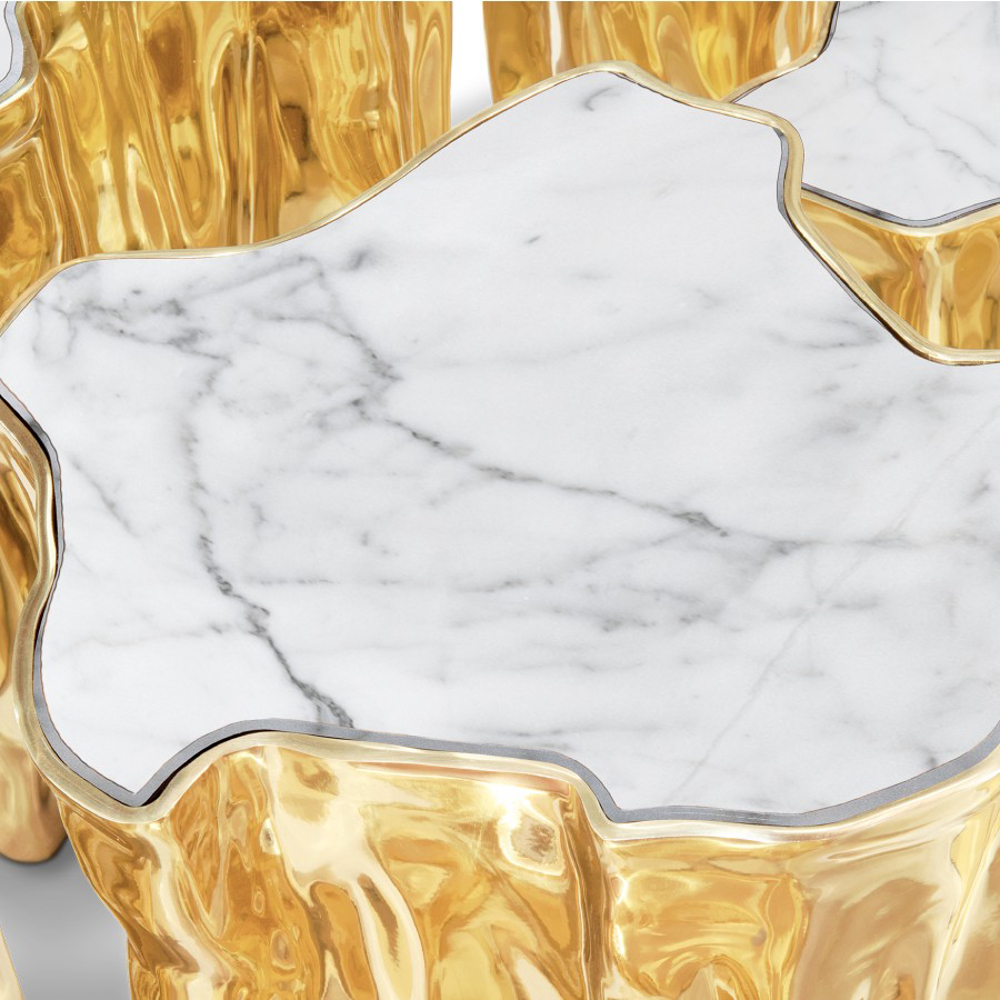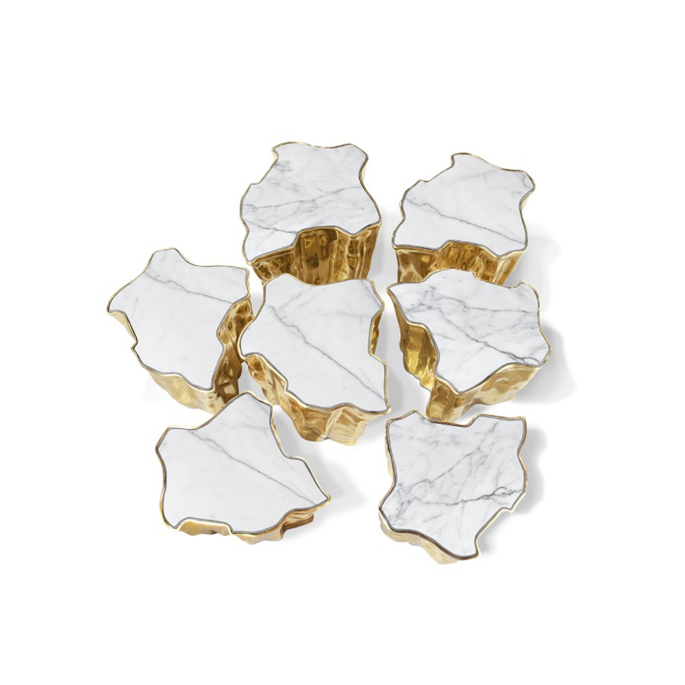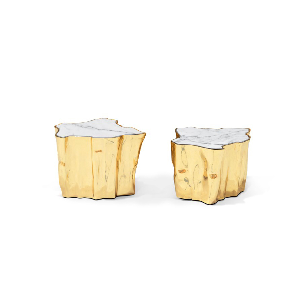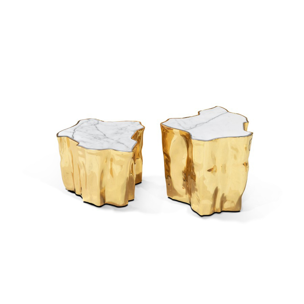 Born from master artisans and the ancient technique of polished cast brass, this statement design pieces incorporate nature-inspired design with industrious welding techniques, being manually assembled, making each piece unique. With delicate lines and bold details, a manually engraved top exposes the heart of a golden tree, boasting a sinuous gold plated base that stood the test of time. It is available in groups of 7, 8 or 14 pieces, with different heights, for unexpected combinations.