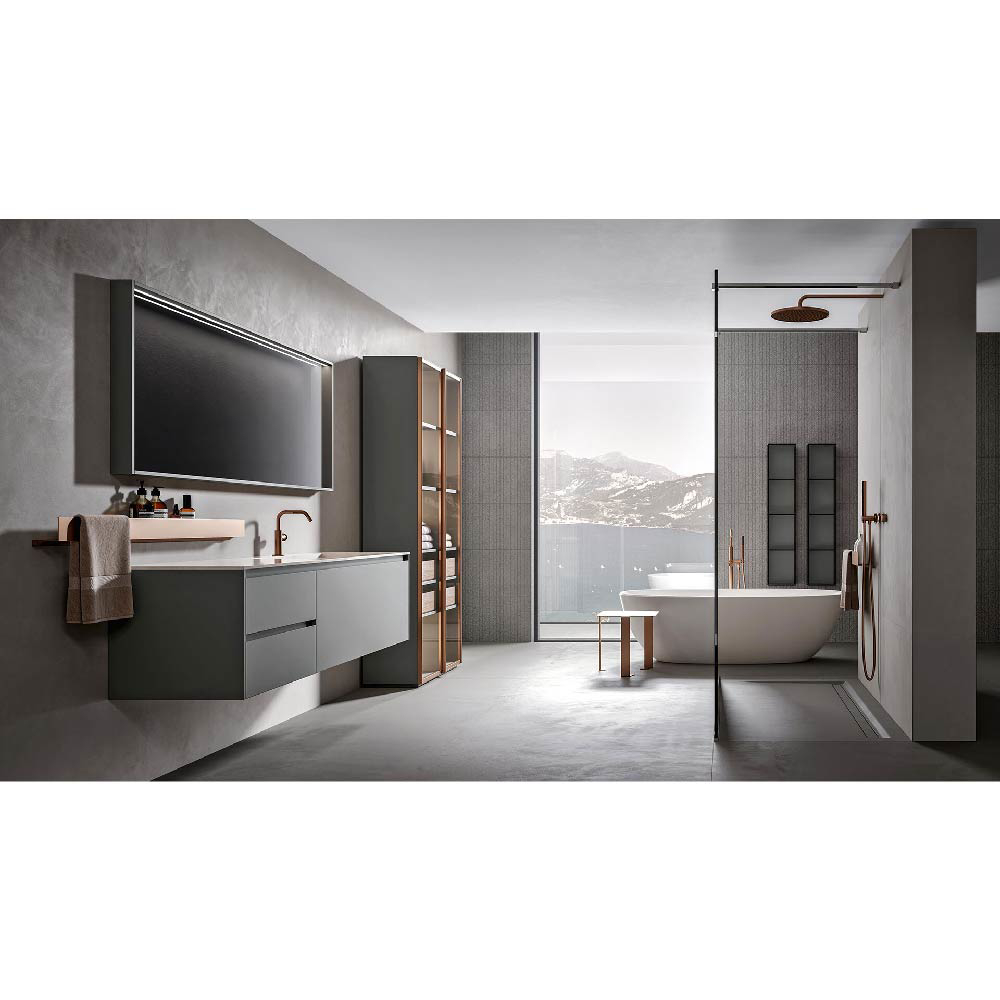 The aesthetic elegance of Eos is characterised by its neat and precise lines. The two sides of only 0.59" thickness embellish and frame the vanity units, while its doors and drawers open through a comfortable 45° flat groove that develops in full length on the fronts. The use of textures leaves plenty of room to solutions of strong visual impact.