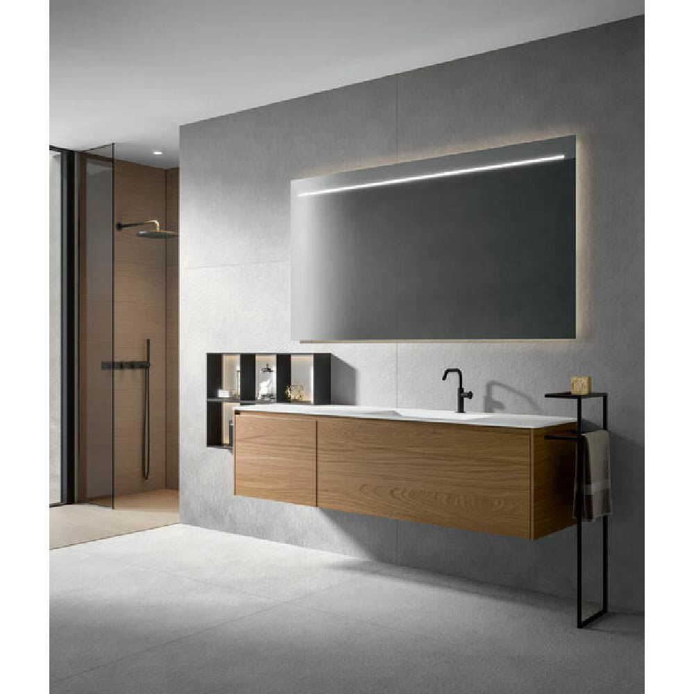 EOS2319 Top in Stone Color Diamante with integrated basin Kuma. Vanity units in Natural Wood Olmo. Mirror with lighting band. Dimensions: W.72.05" D.19.69"