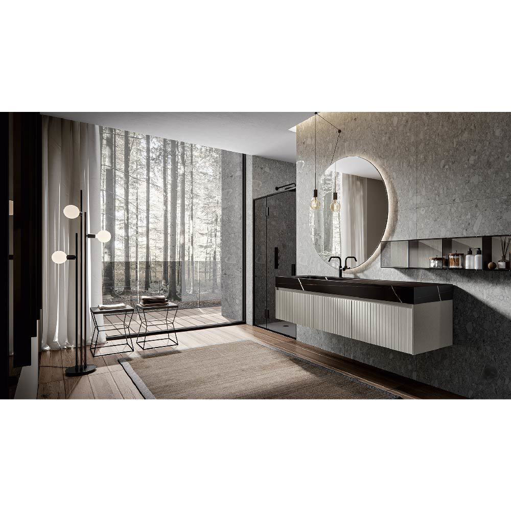 The aesthetic elegance of Eos is characterised by its neat and precise lines. The two sides of only 0.59" thickness embellish and frame the vanity units, while its doors and drawers open through a comfortable 45° flat groove that develops in full length on the fronts. The use of textures leaves plenty of room to solutions of strong visual impact.