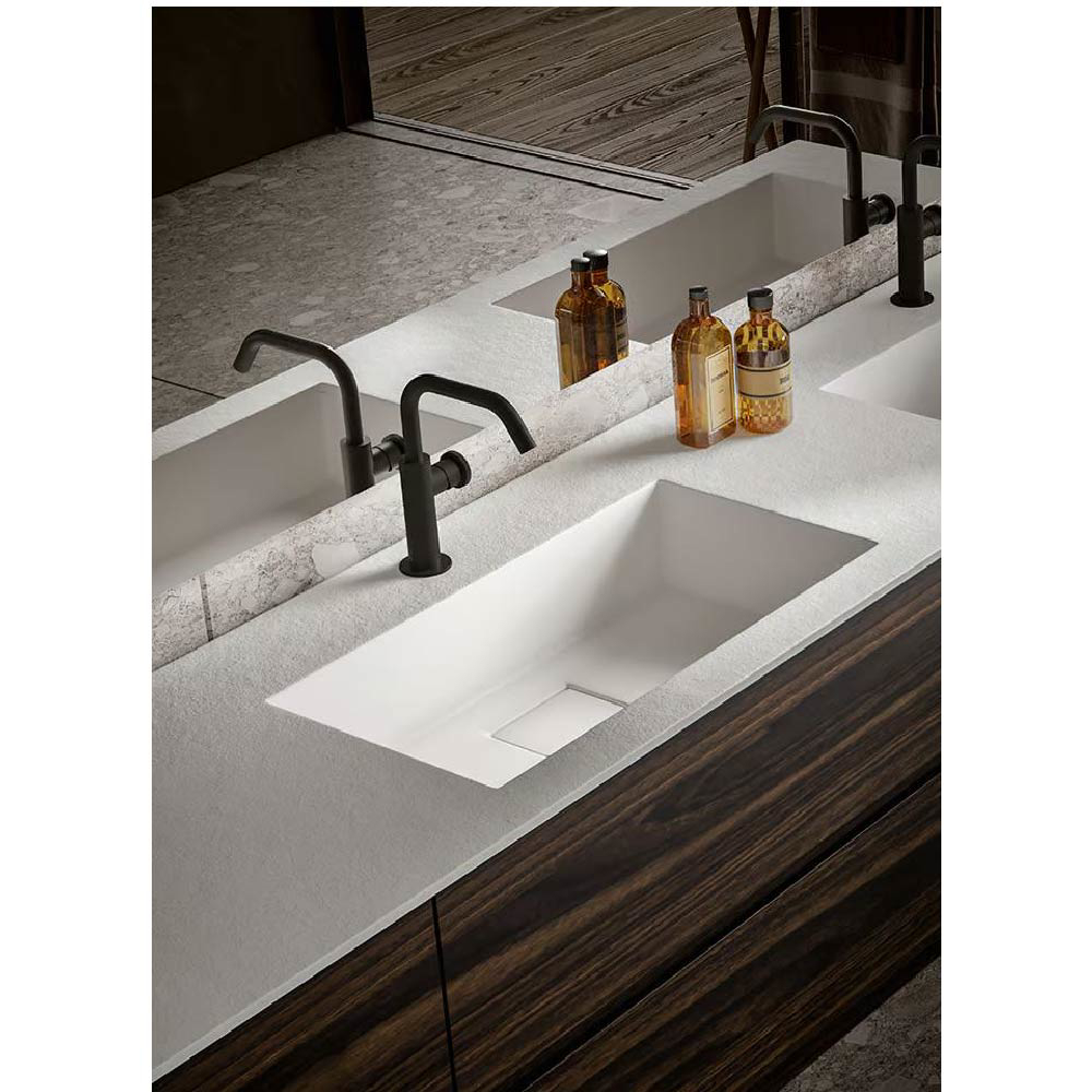Minimal, but not too much: Nike is characterized by the juxtaposition of the clean volumes of sides and fronts with the strong geometric rigour of the central groove that develops all-around the vanity units, becoming the true main character of this collection. The 45° cut groove is not only a functional element, but it also creates a play of solids and voids, of lightness opposed to thickness, which fully embodies the know-how where Edoné production is grounded.