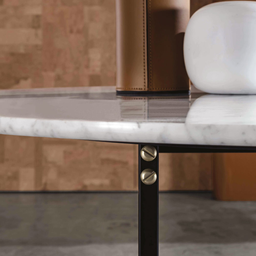 Egadi, oval or round, is a table with deliberately simple shapes, which stands out from the different combinations of materials with an elegant and sophisticated taste. The base, made in metal, it is embellished with studs that give it majesty. The top, in inlaid wood or marble, give the table an extreme elegance.