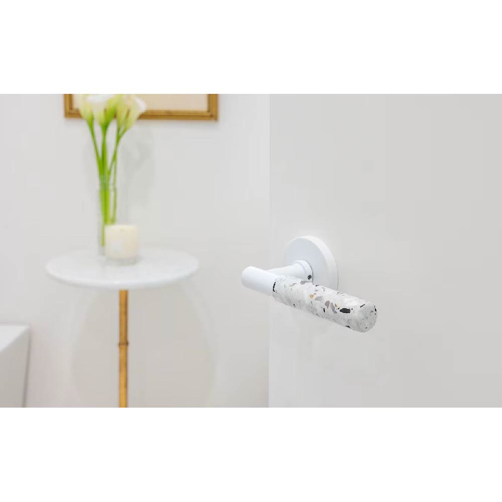  Terrazzo is a stone composite made from marble, granite, quartz, or glass chips mixed with cement or resin.  It features natural and unique patterns created by the combination of materials, adding a pop of color to your door hardware.